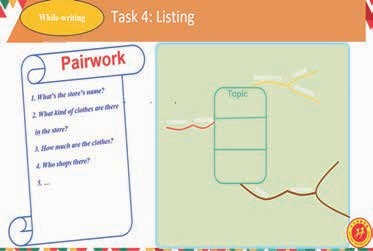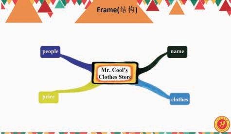 活动设计: 学生两人一组对话, 让学生初步在大脑构思服装店广告的内容。做完对话后,学生填充思维导图。