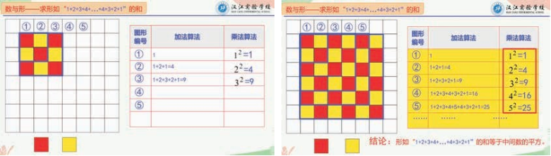 学生小组讨论,集体汇报,最后总结出结论:从1开始的连续奇数相加,和等于加数个数的平方。