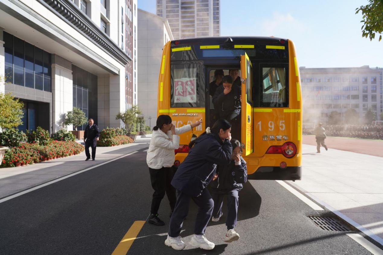 “演练”促防范 让“安全”伴我行——汉江实验学校举行校车应急疏散演练。