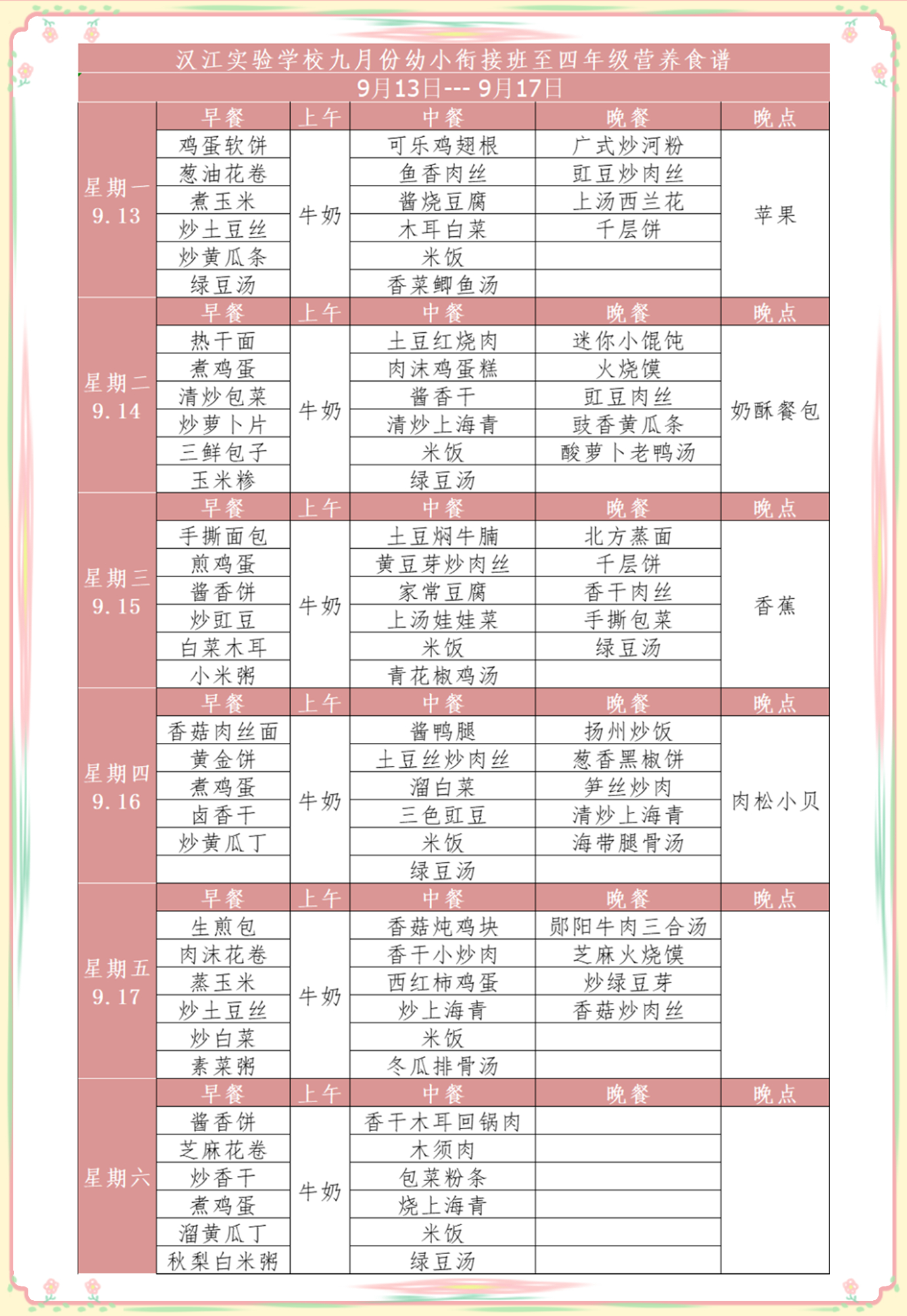 汉江实验学校2021年9月13日-2021年9月17日学生食谱公示