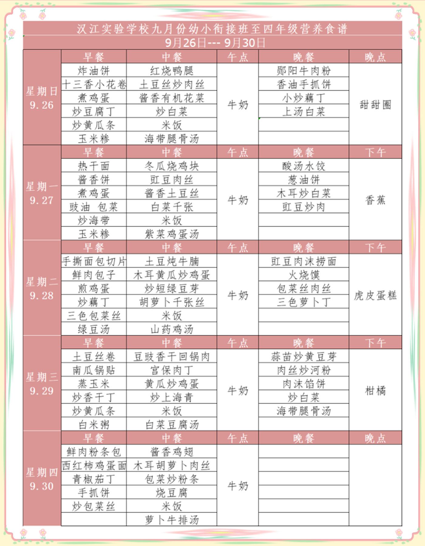 汉江实验学校2021年9月26日-2021年9月30日学生食谱公示