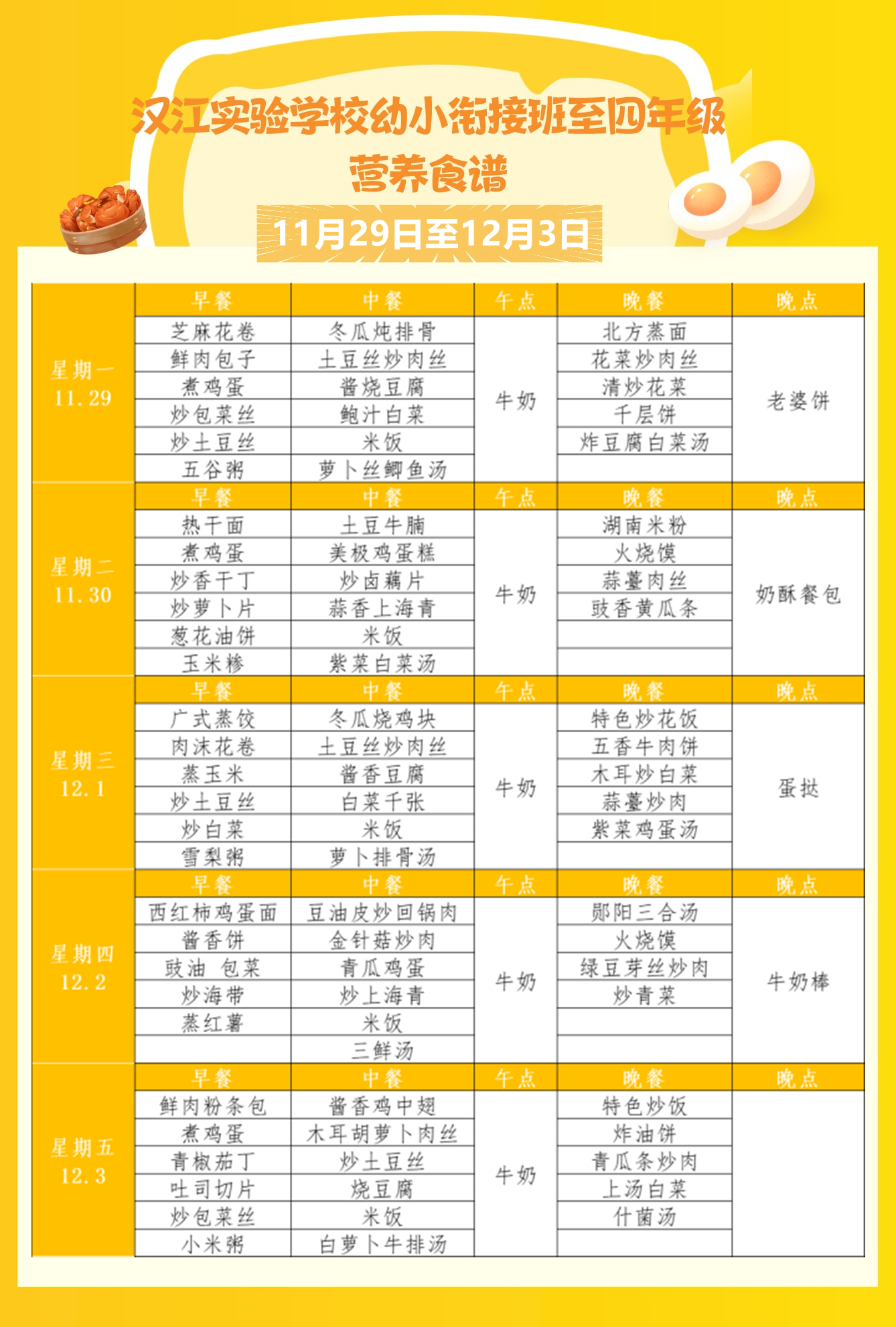 汉江实验学校2021年11月29日-2021年12月4日学生食谱公示