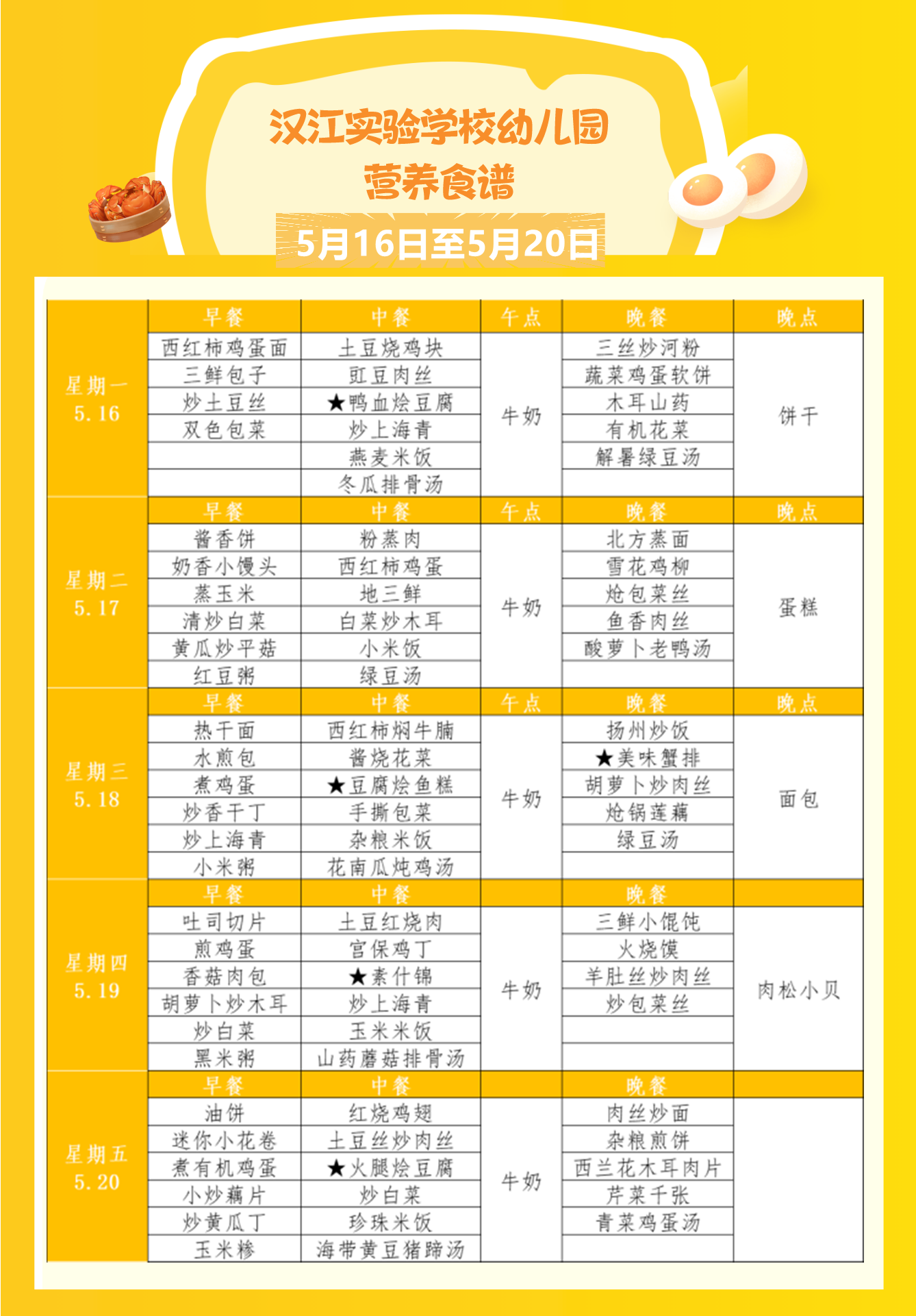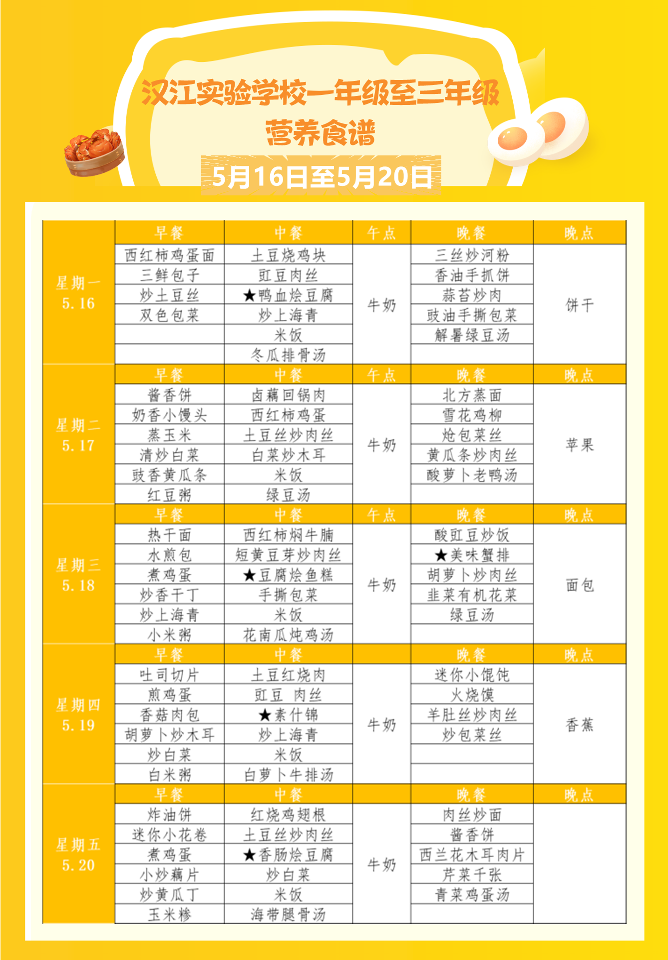 汉江实验学校2022年5月16日-2022年5月21日学生食谱公示