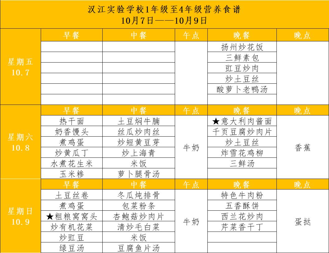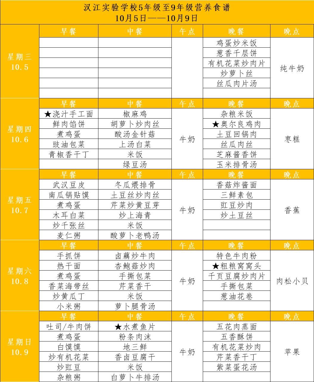 汉江实验学校2022年10月5日-2022年10月9日学生食谱公示