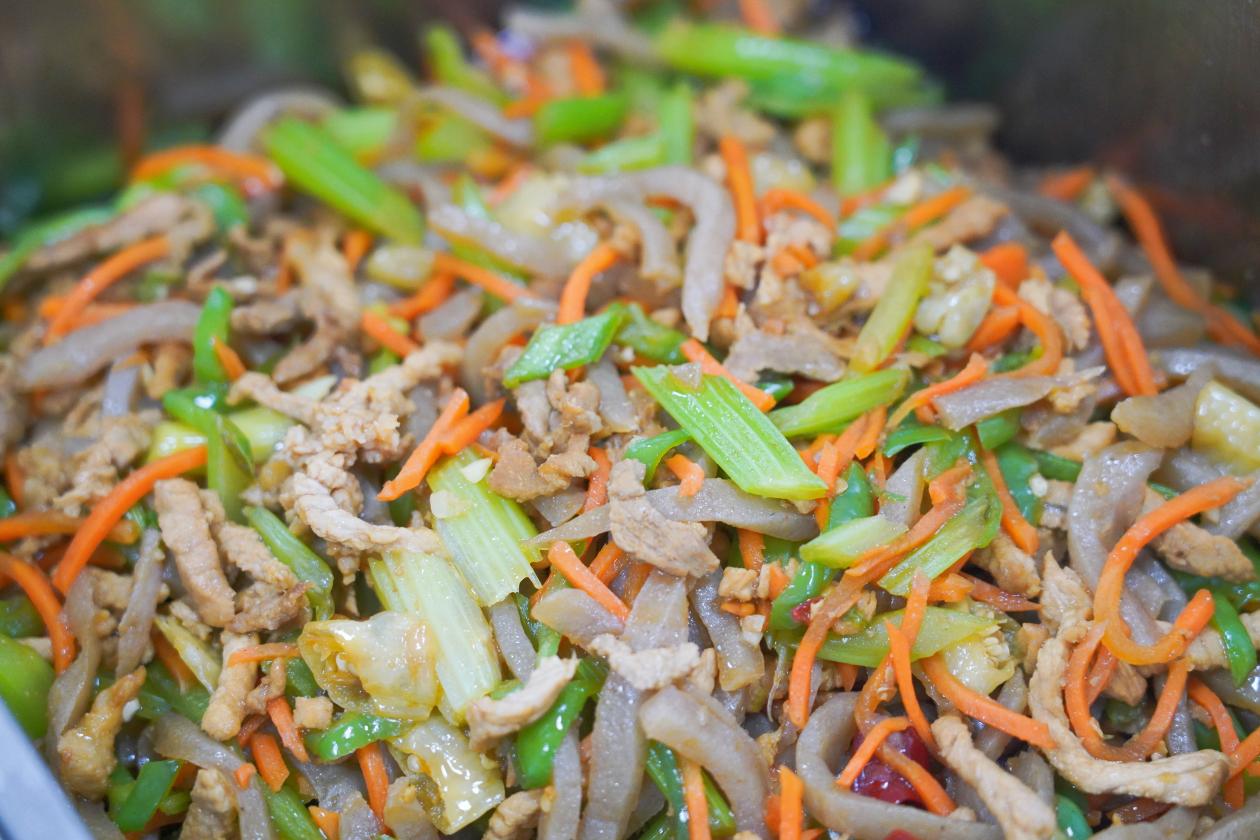 晚餐:牛肉粉、红豆卷、青瓜木耳肉片、芹菜香干丝
