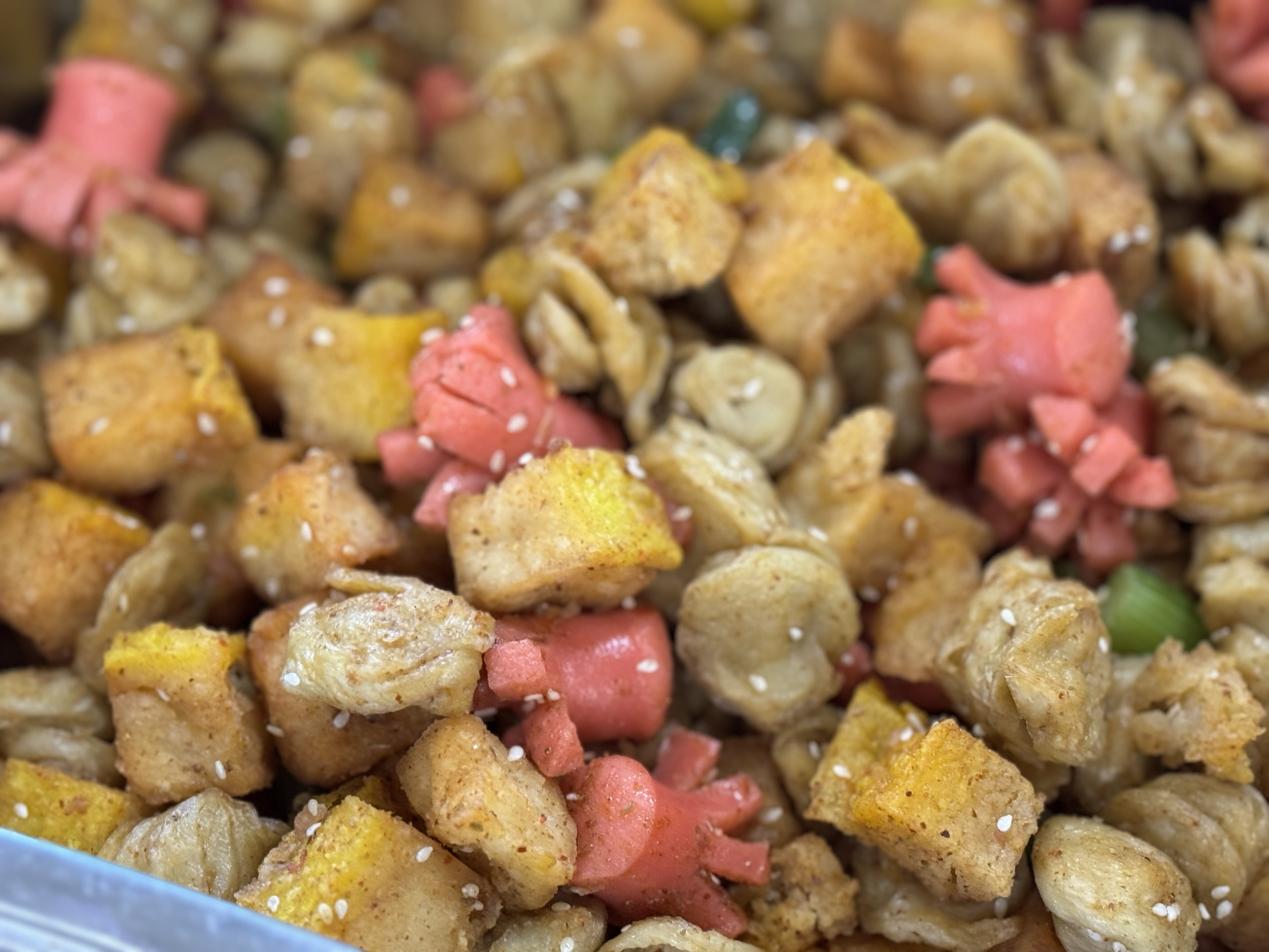中餐:酱香鸡块、卤豆腐丝肉丝、糖醋藕丁、猪油核桃纹、米饭、三鲜鱼丸汤