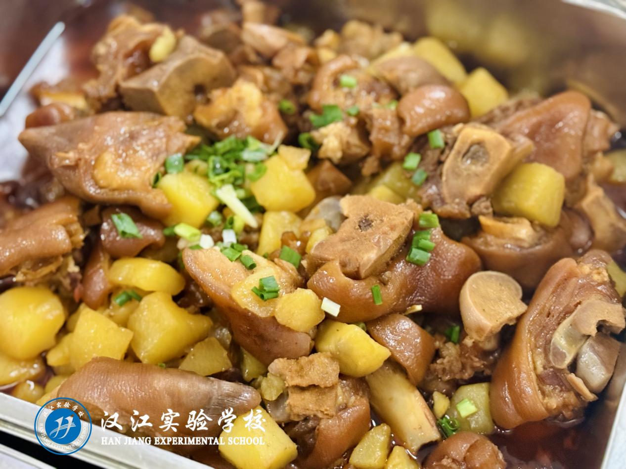 中餐:红烧猪手、青椒千张肉丝、泡椒土豆片、白灼生菜、白菜豆腐汤、米饭