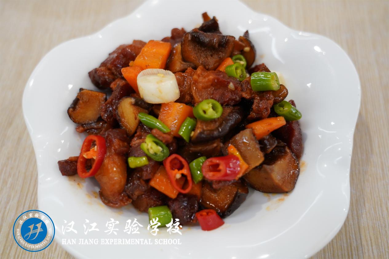 中餐:五香干煸鸭、青椒魔芋肉丝、豆油皮炒奶白菜、肉末冬瓜、萝卜丝肉丸汤、米饭