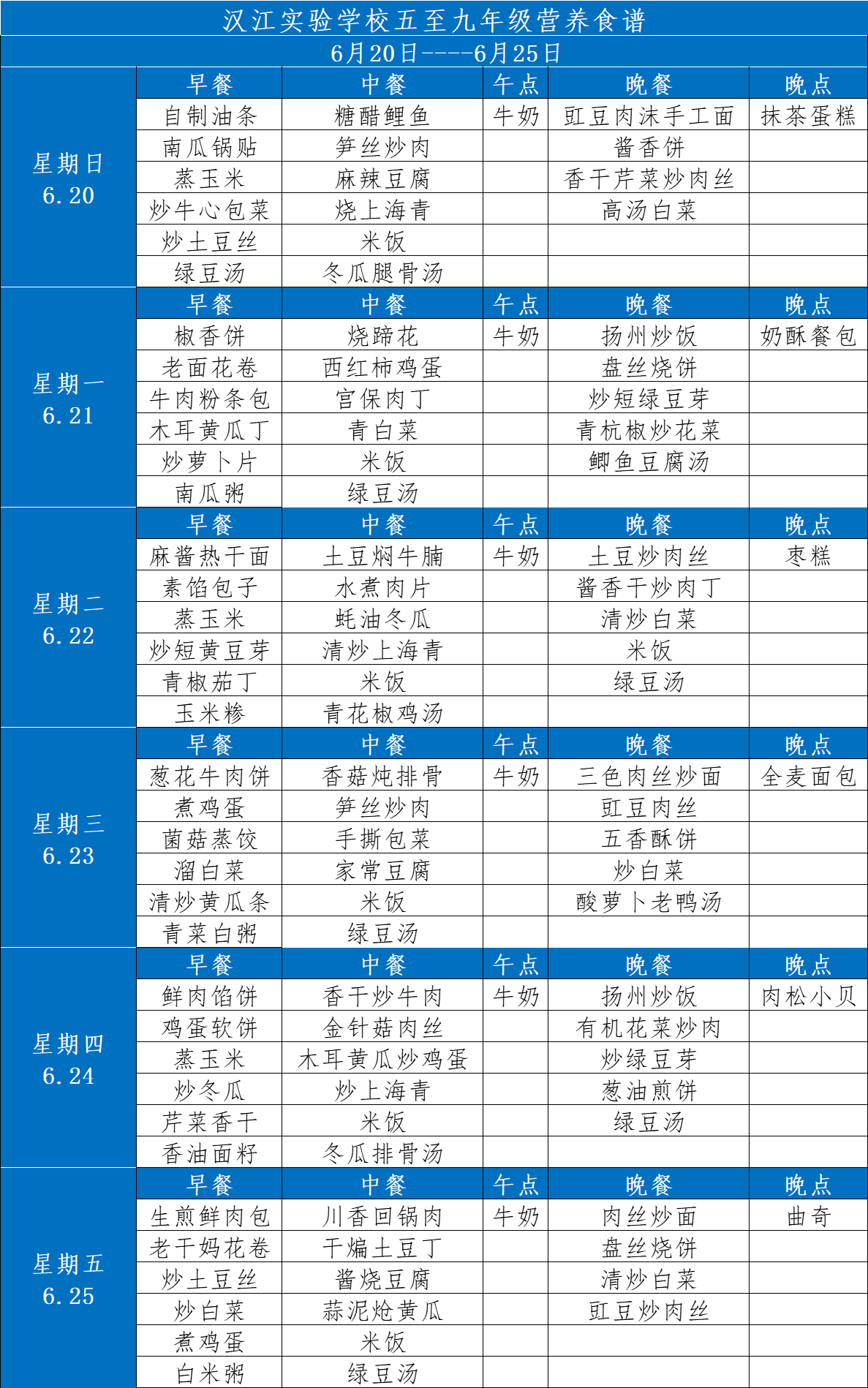 汉江实验学校2021年6月20日-2021年6月25日学生食谱公示: