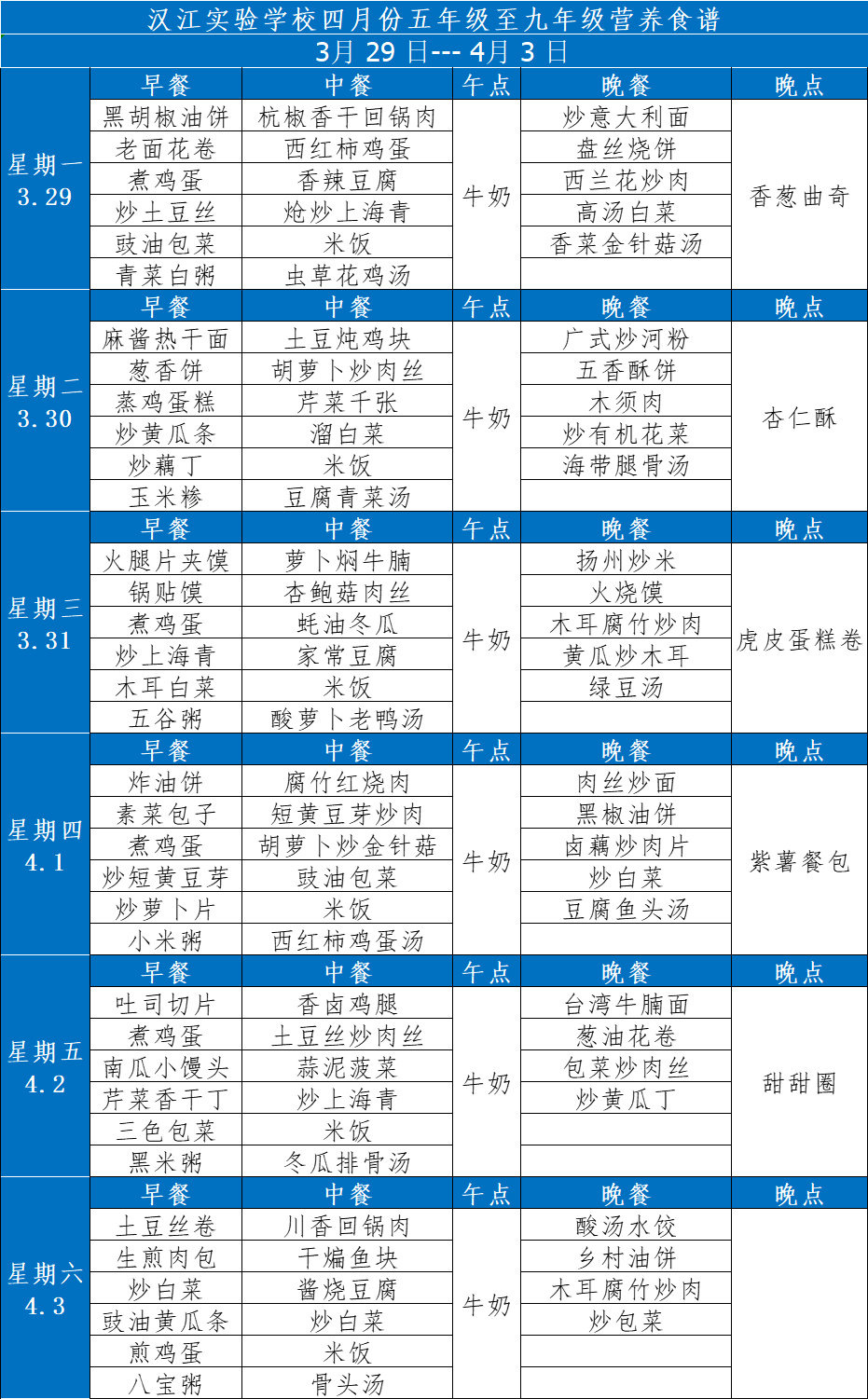 汉江实验学校2021年3月29日-2021年4月3日学生食谱公示: