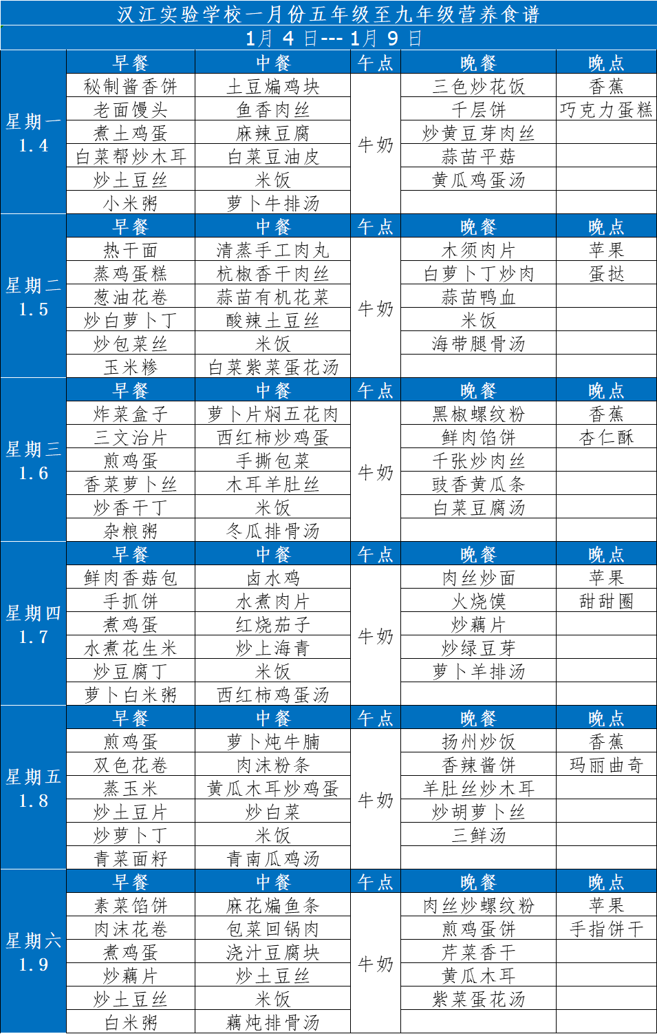 汉江实验学校2021年1月4日-2021年1月9日学生食谱公示: