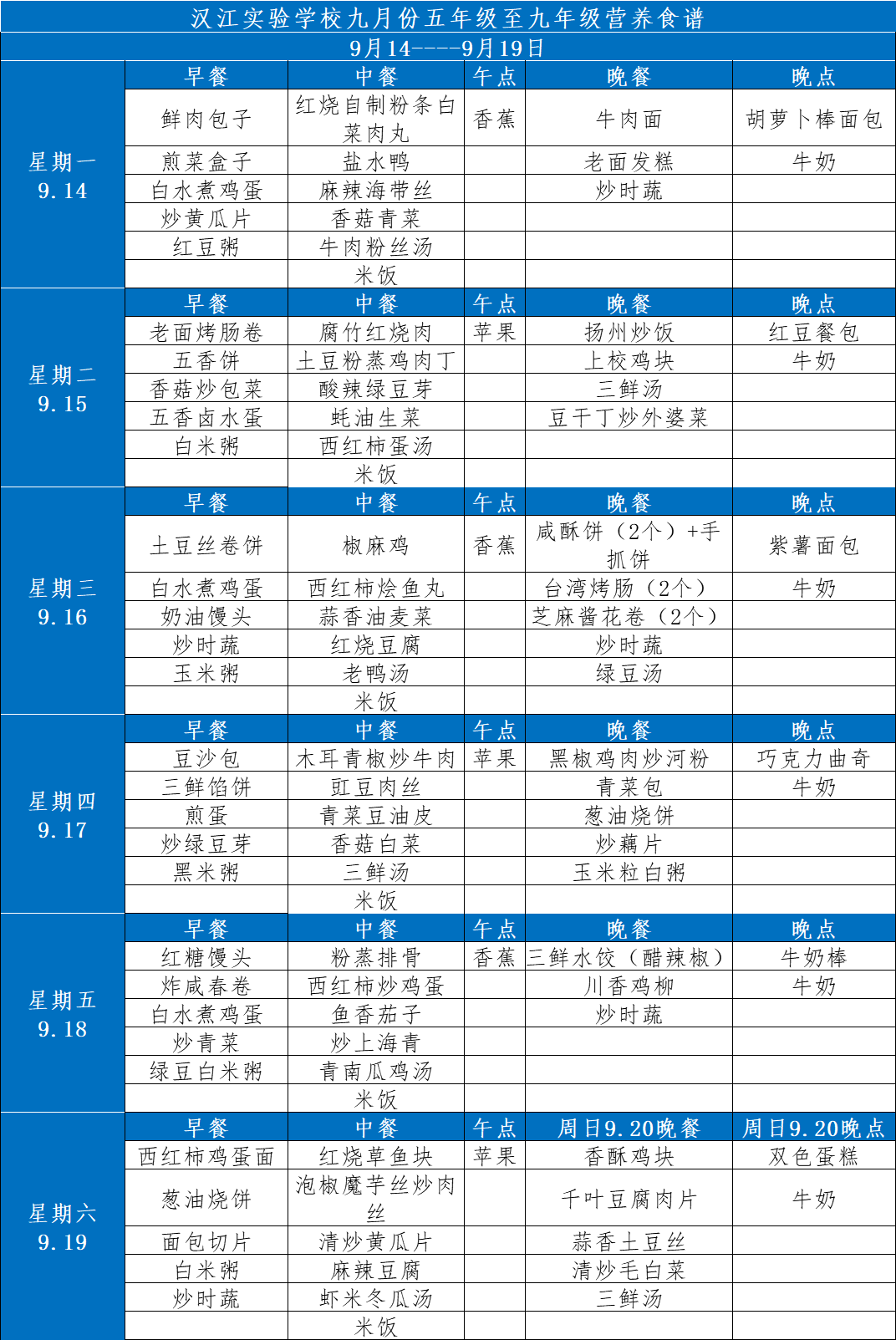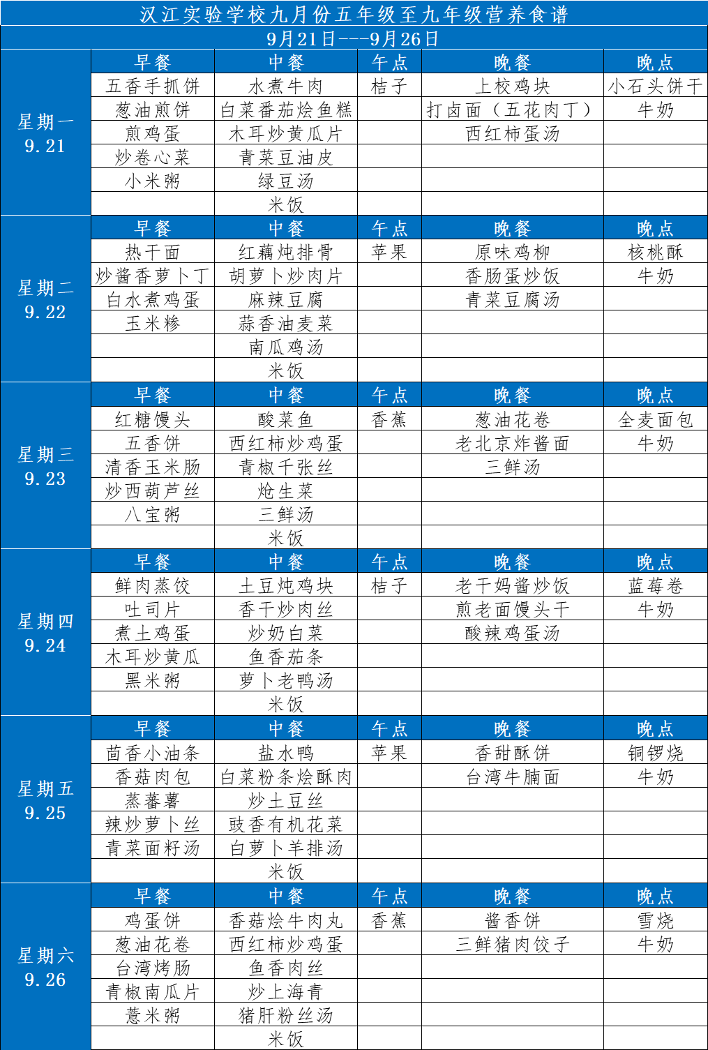 汉江实验学校2020年9月21日-26日学生食谱公示