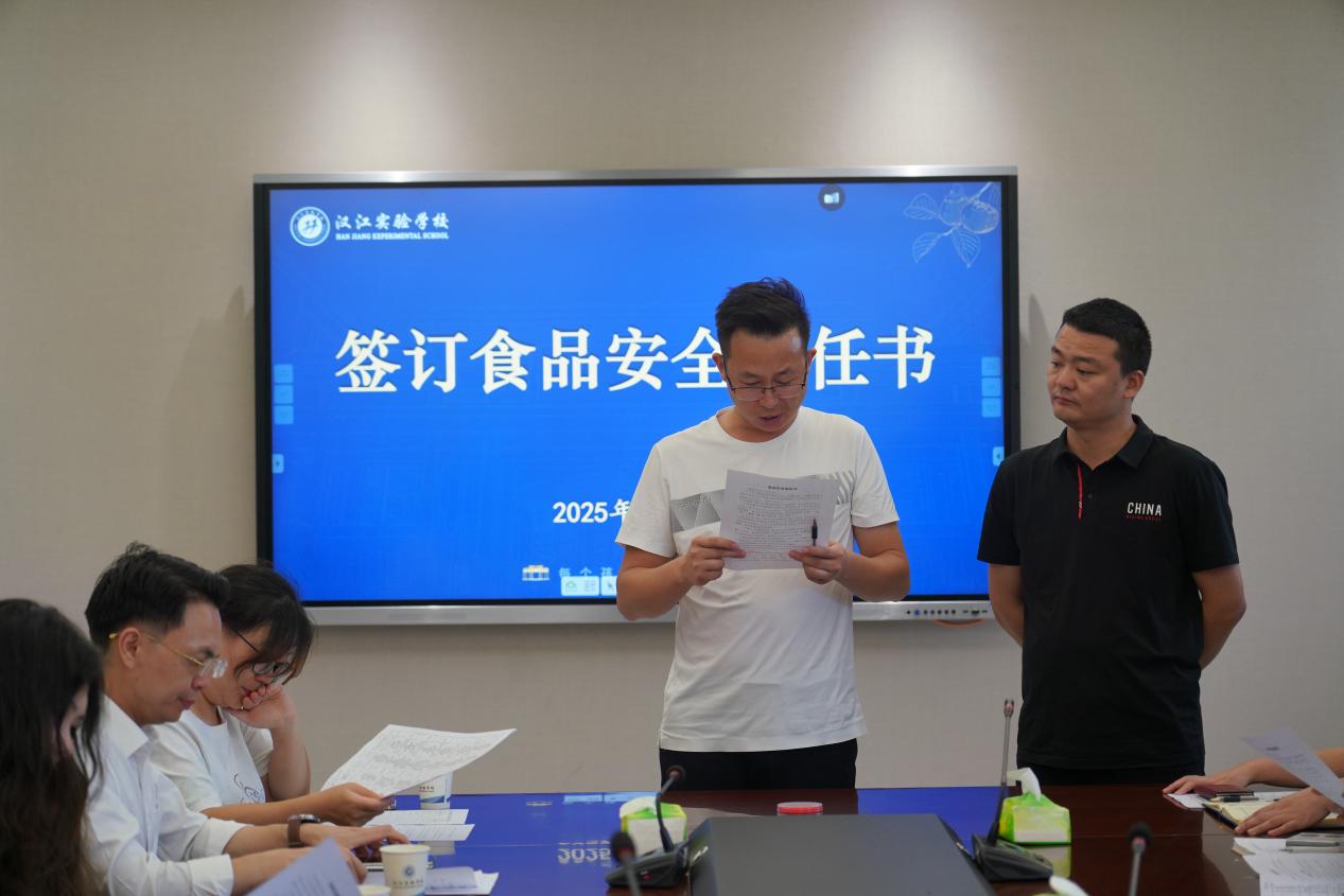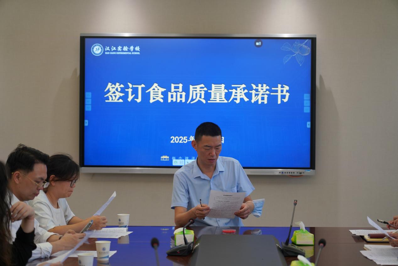学校党支部组织委员、副校长杨志,工会主席江玲分别与食堂部门负责人共同签订《食品安全责任书》和《食品质量承诺书》,全力保障学生舌尖上的安全、营养和健康。