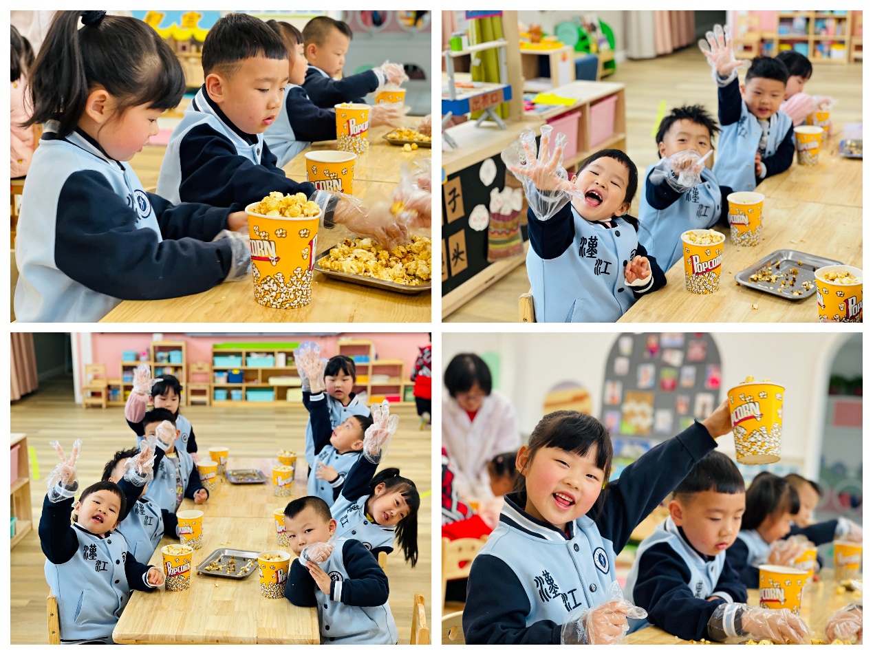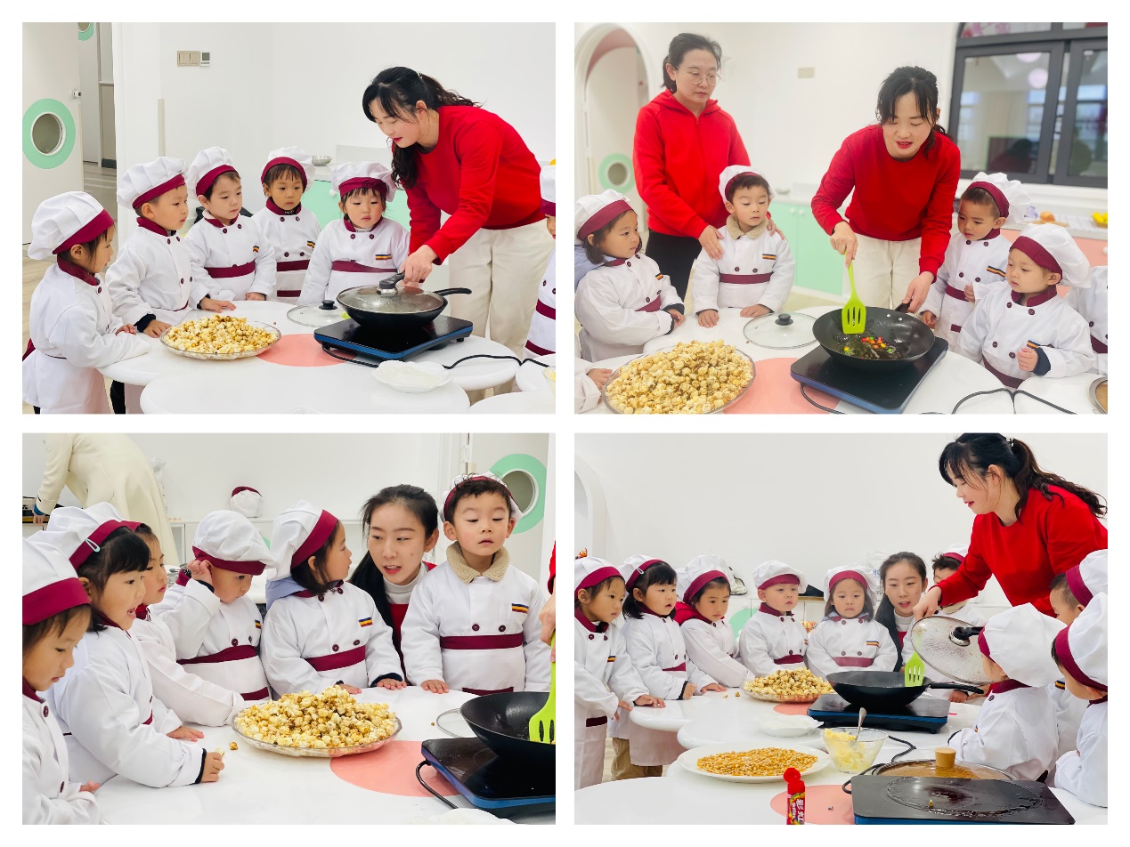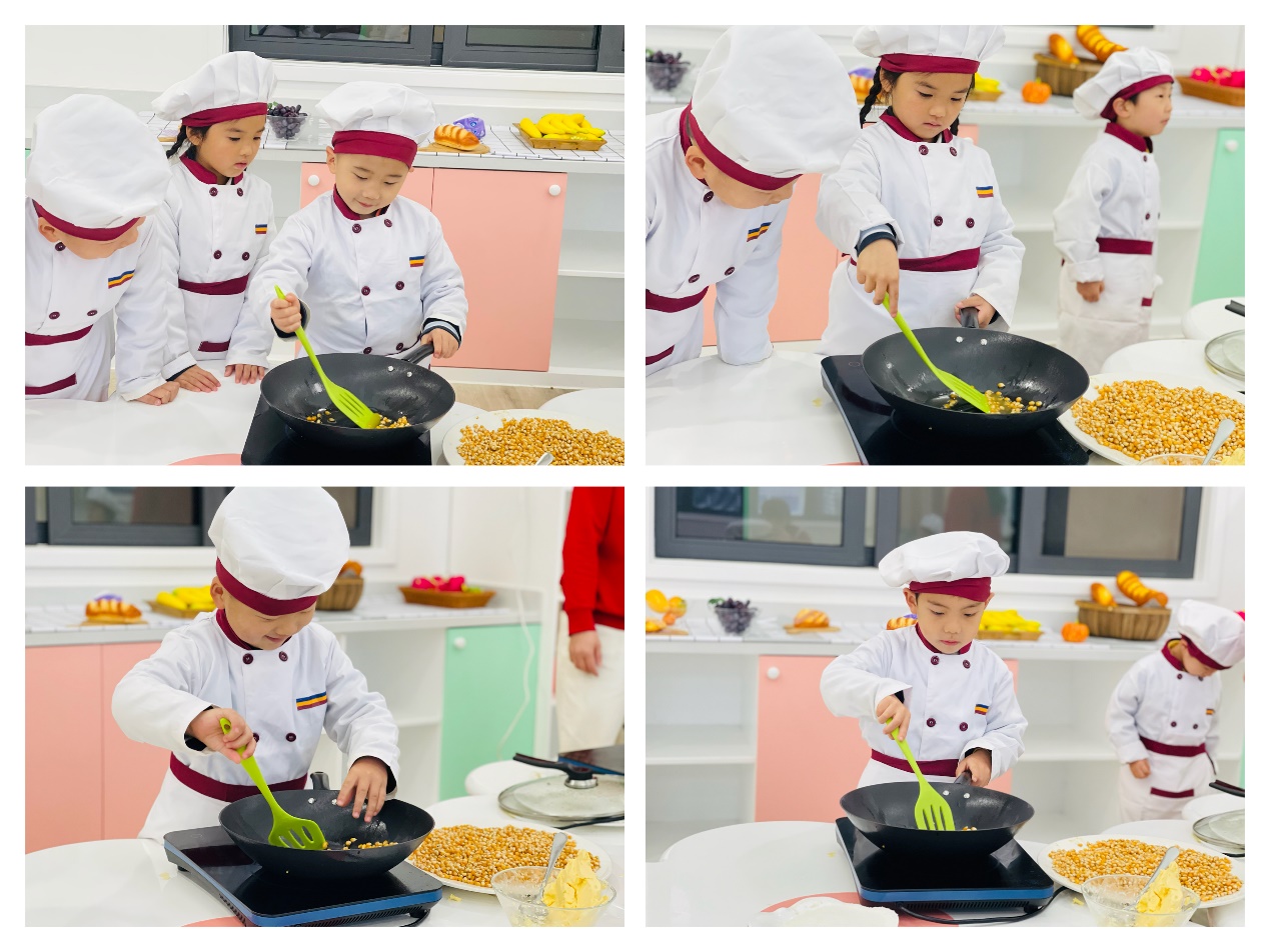 一颗颗小玉米,放进油锅里,噼里啪啦,噼里啪啦,小小的玉米粒在加热后变成了一锅美味的爆米花,香喷喷的味道弥漫在教室中......瞧!我们的小厨师们也想要迫不及待一展身手呢?