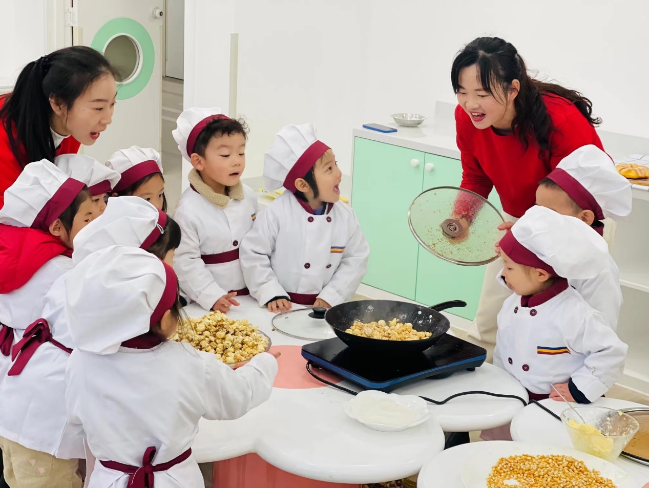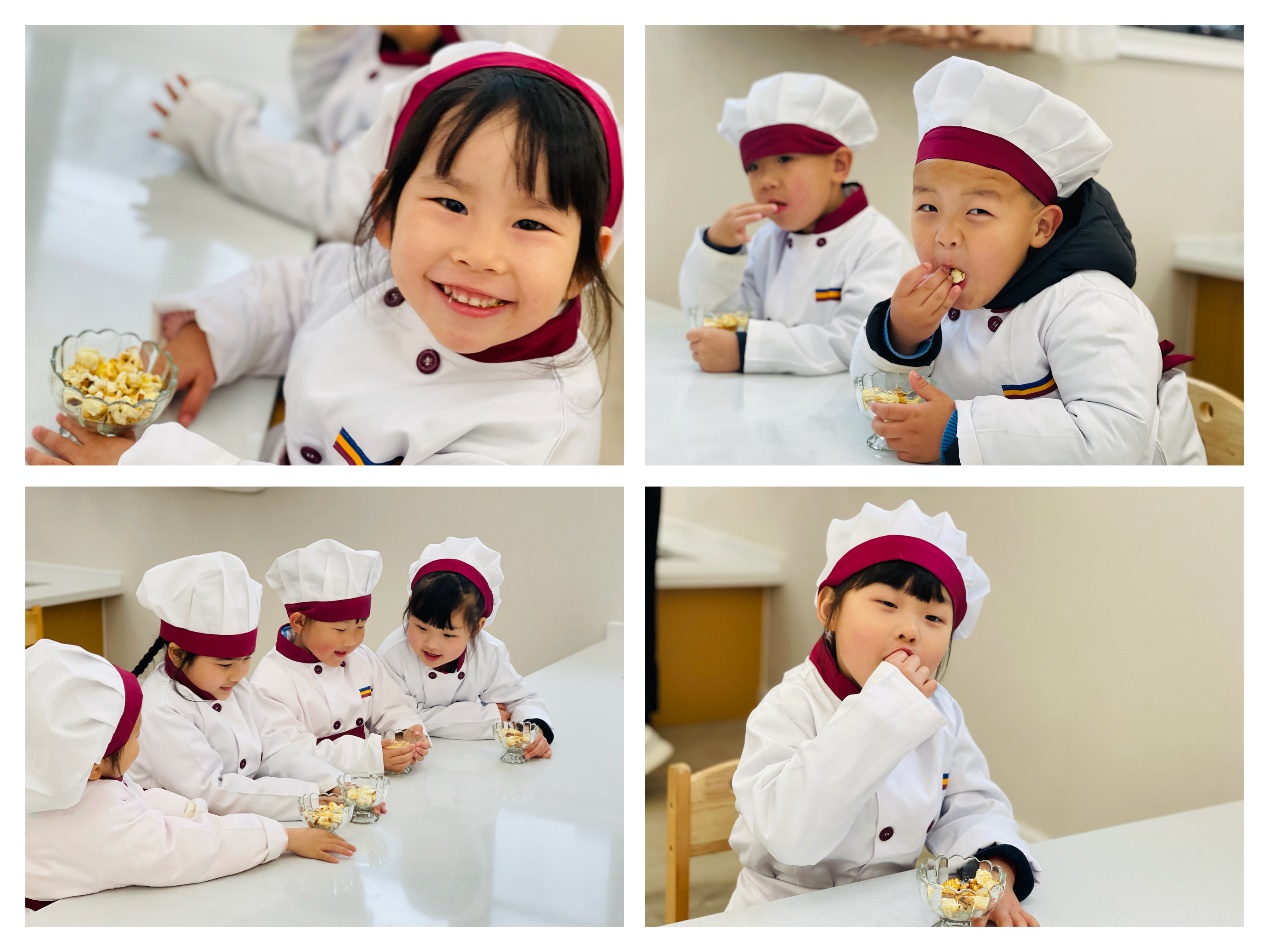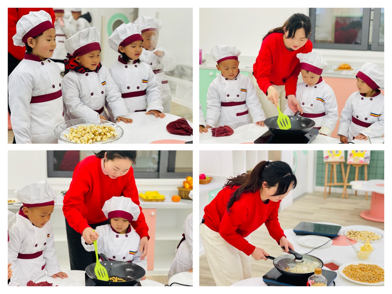 一颗颗小玉米,放进油锅里,噼里啪啦,噼里啪啦,小小的玉米粒在加热后变成了一锅美味的爆米花,香喷喷的味道弥漫在教室中......瞧!我们的小厨师们也想要迫不及待一展身手呢?