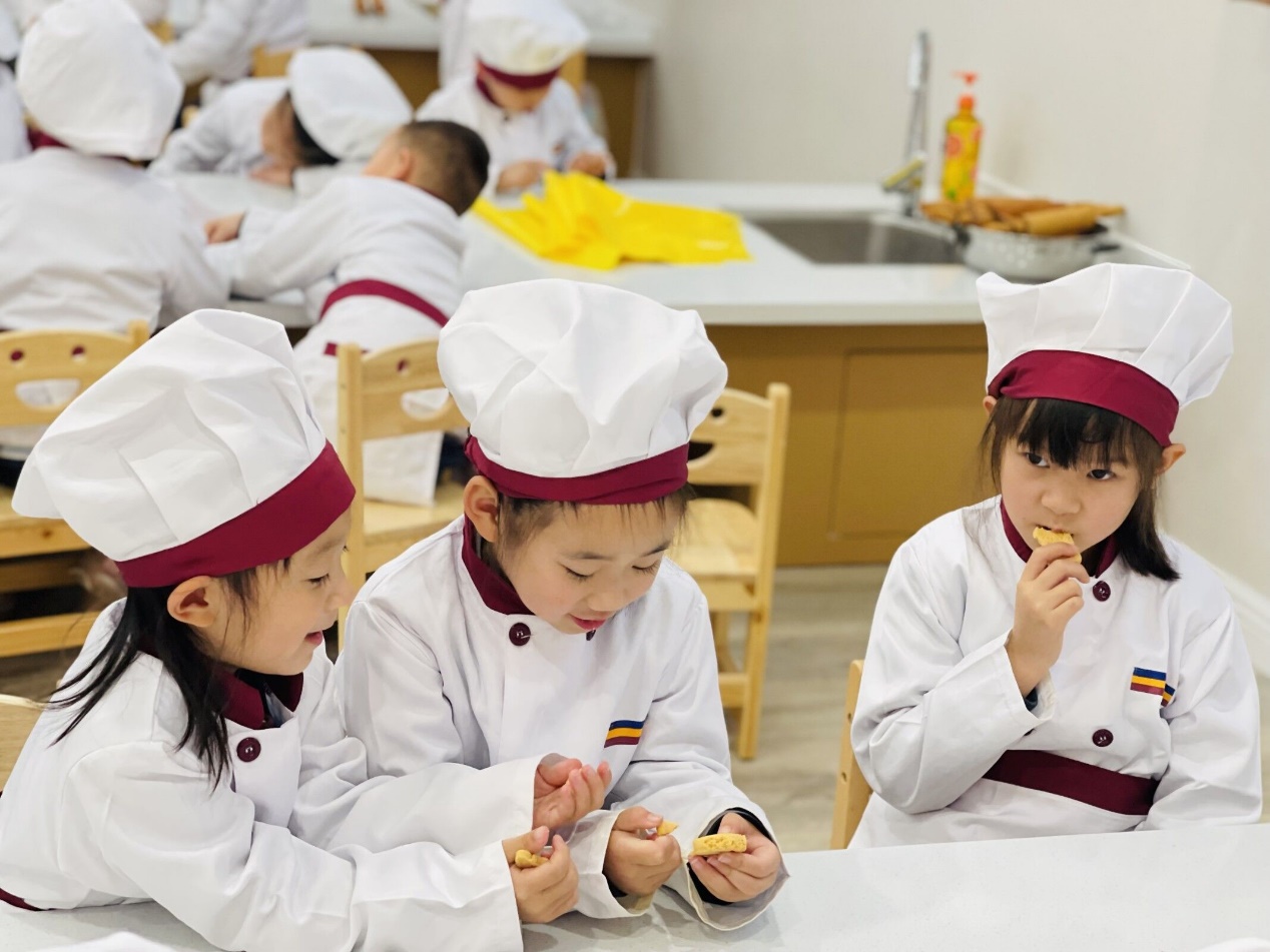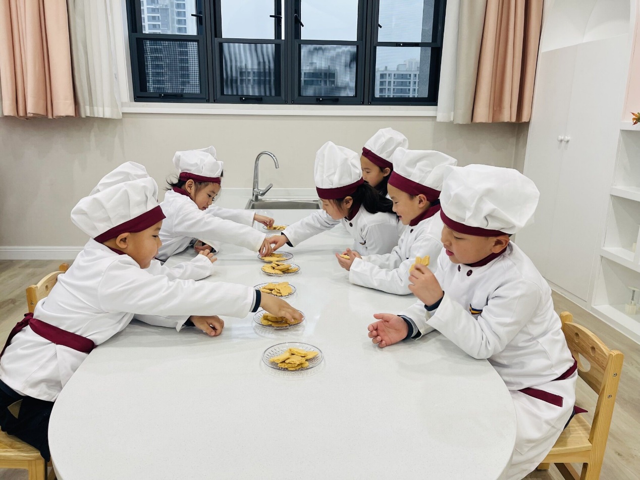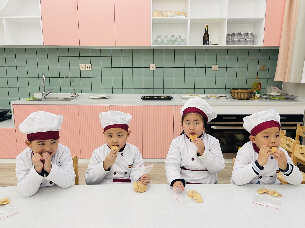 美味香甜的饼干出炉啦,纯真可爱的孩子们兴致勃勃的品味着自己亲手制作的美食。