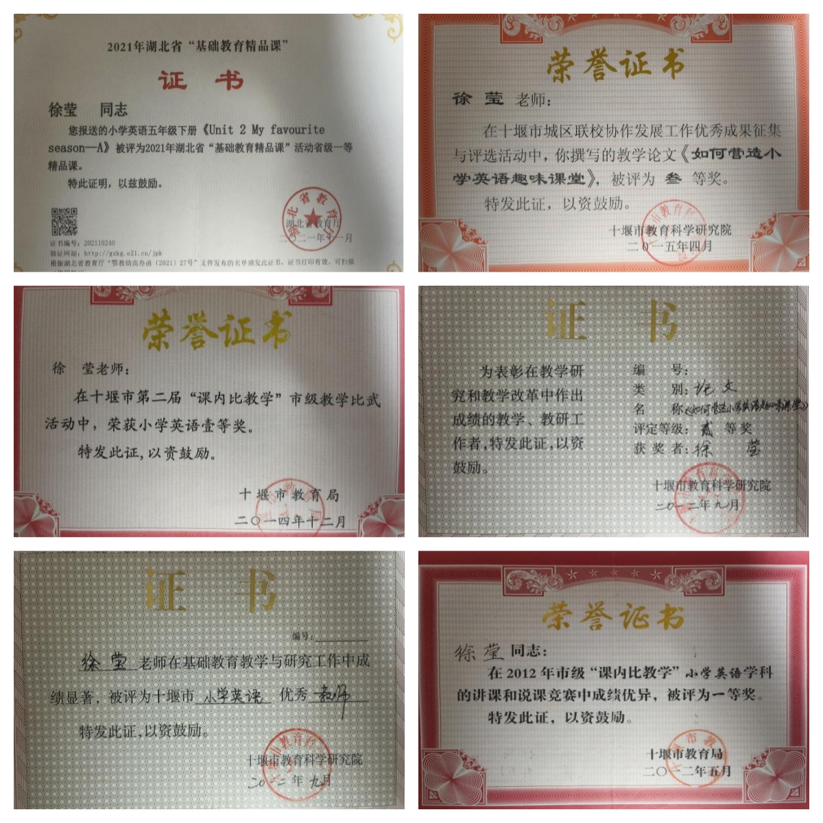 徐莹,中共党员,大学本科,从教15余年,一直从事小学英语教学工作。她教学能力突出,被评为十堰市“小学英语优秀教师”、茅箭区“小学英语学科带头人”,曾荣获湖北省精品课程大赛一等奖,十堰市教学比武大赛一等奖,茅箭区金烛杯竞赛一等奖,以及多次荣获校内教学大赛一等奖。具有新颖独特的教学风格,性格活泼开朗,深受学生喜爱。
