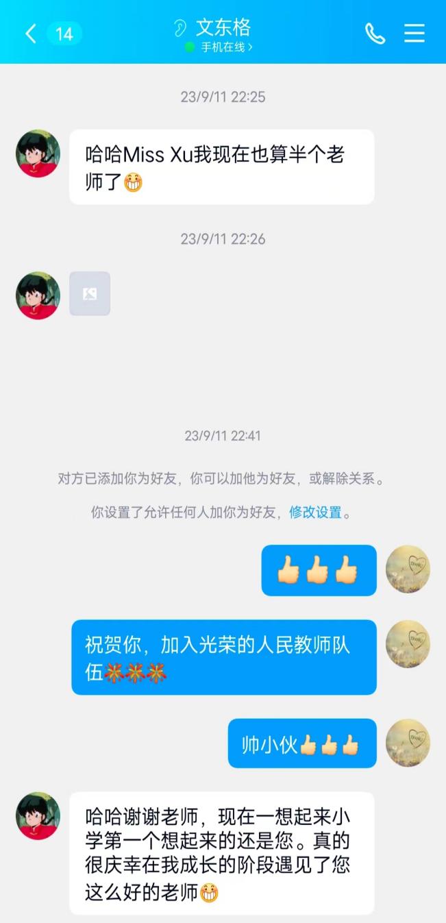 她给予孩子们支持和鼓励,让孩子们在英语学习的道路上不断进步。“因为你我才喜欢上的英语”这句话时刻激励着徐老师,多年后的学生仍然能记得她是一件多么幸福的事情啊!
