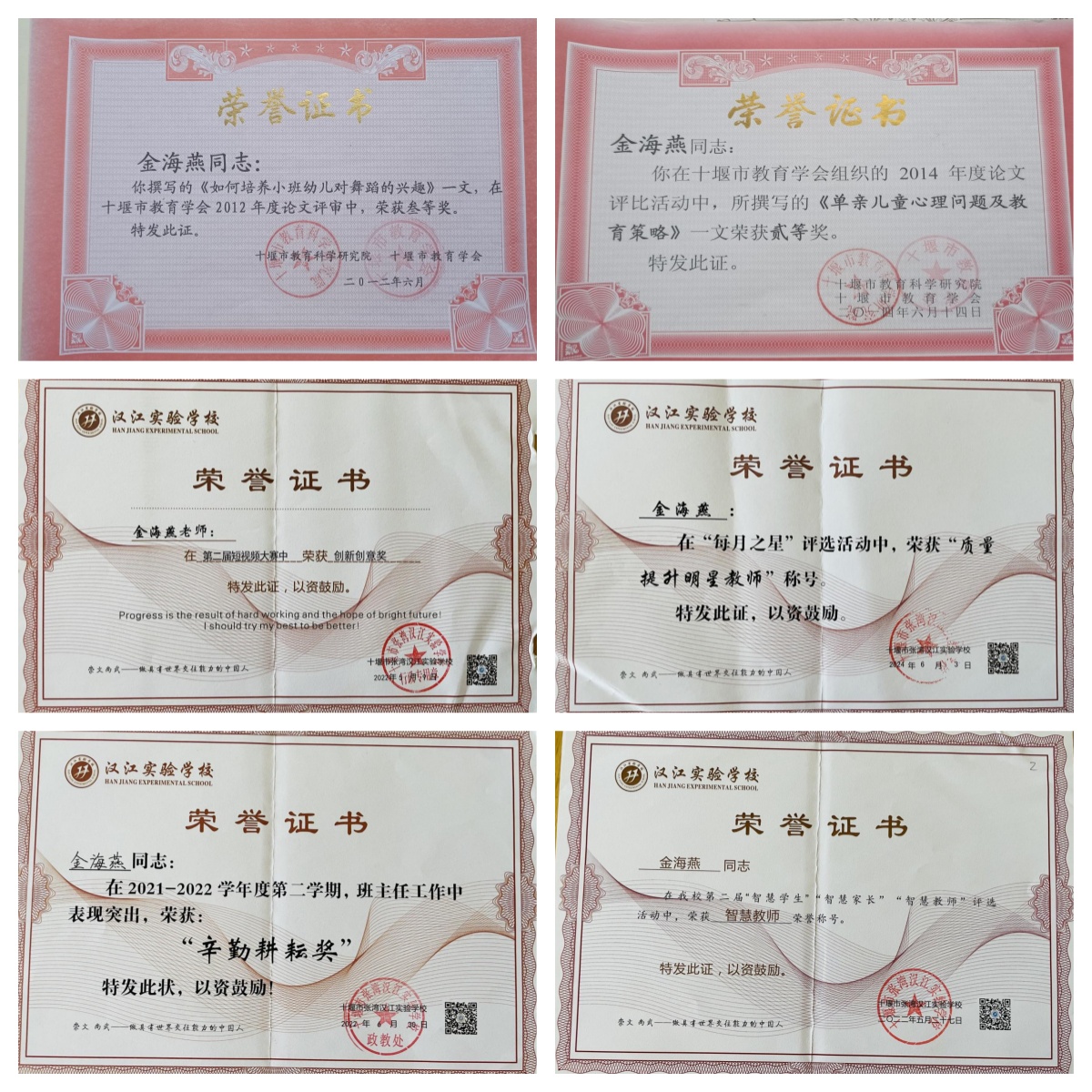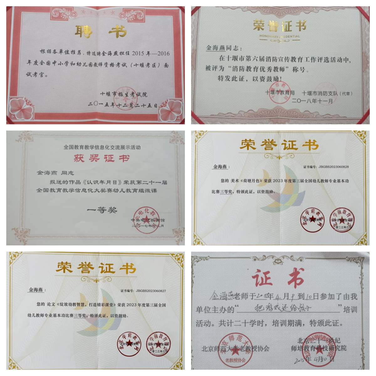 金海燕,学前教育专业毕业,十四载风云变迁,始终坚守在幼教岗位,用满腔的热情投身于幼教事业,现任汉江幼儿园大一班班主任兼年级组长工作。曾获得全国幼儿教师资格证面试官,国家级微课“一等奖”,十堰市消防安全教育“优秀教师”,多次获省、市级论文、课件、案例一、二、三等奖项,获得校级“优秀教师”“优秀班主任”“智慧教师”等荣誉。