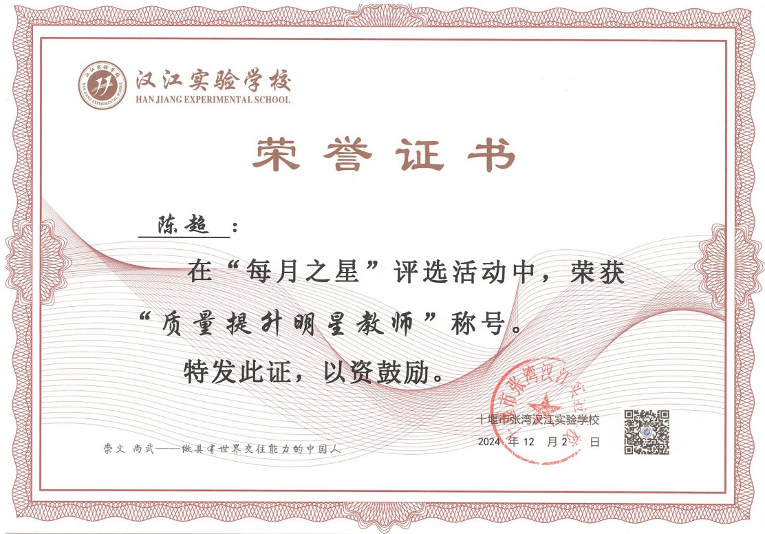 陈超老师是小学六年级数学教师,今年是他在校任教的第四年。他所带班级数学成绩稳步提升,被评为汉江实验学校十一月质量提升明星教师。