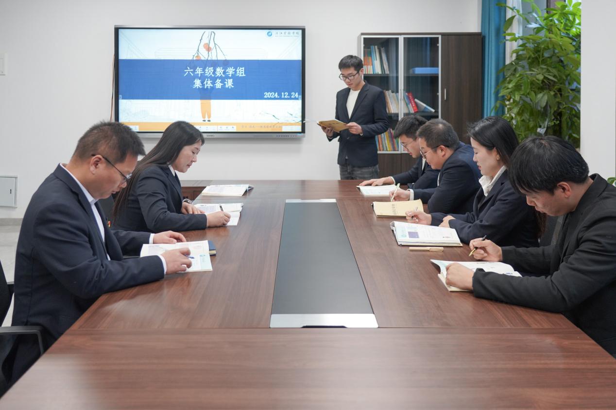 六年级数学备课组按照知识点与课时设置,安排主备教师,在周期性备课会议中打磨课件。主备教师从基本思路、课堂流程、重难点剖析等角度,串联课件进行完整说课,备课组内其他教师共同商讨、调整内容,整个年级统一教案,从而统一教学。陈老师结合自身备课及教学经验,提出自己的建议与想法,反复打磨课件,优化教学方案。