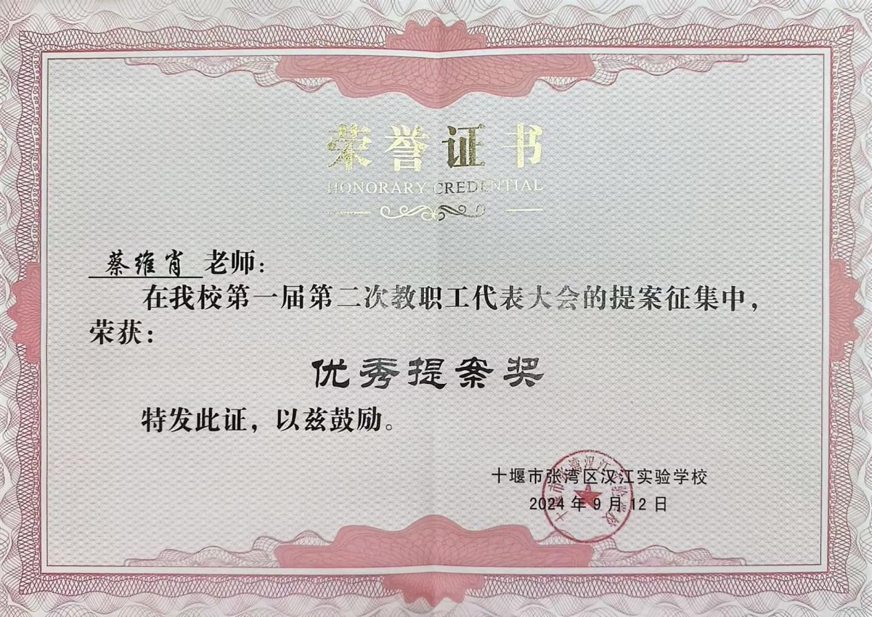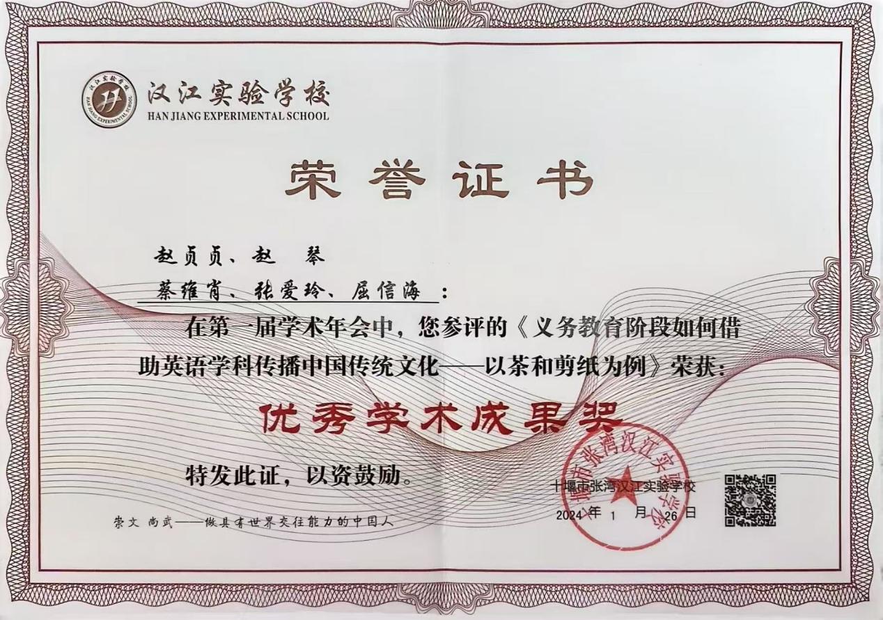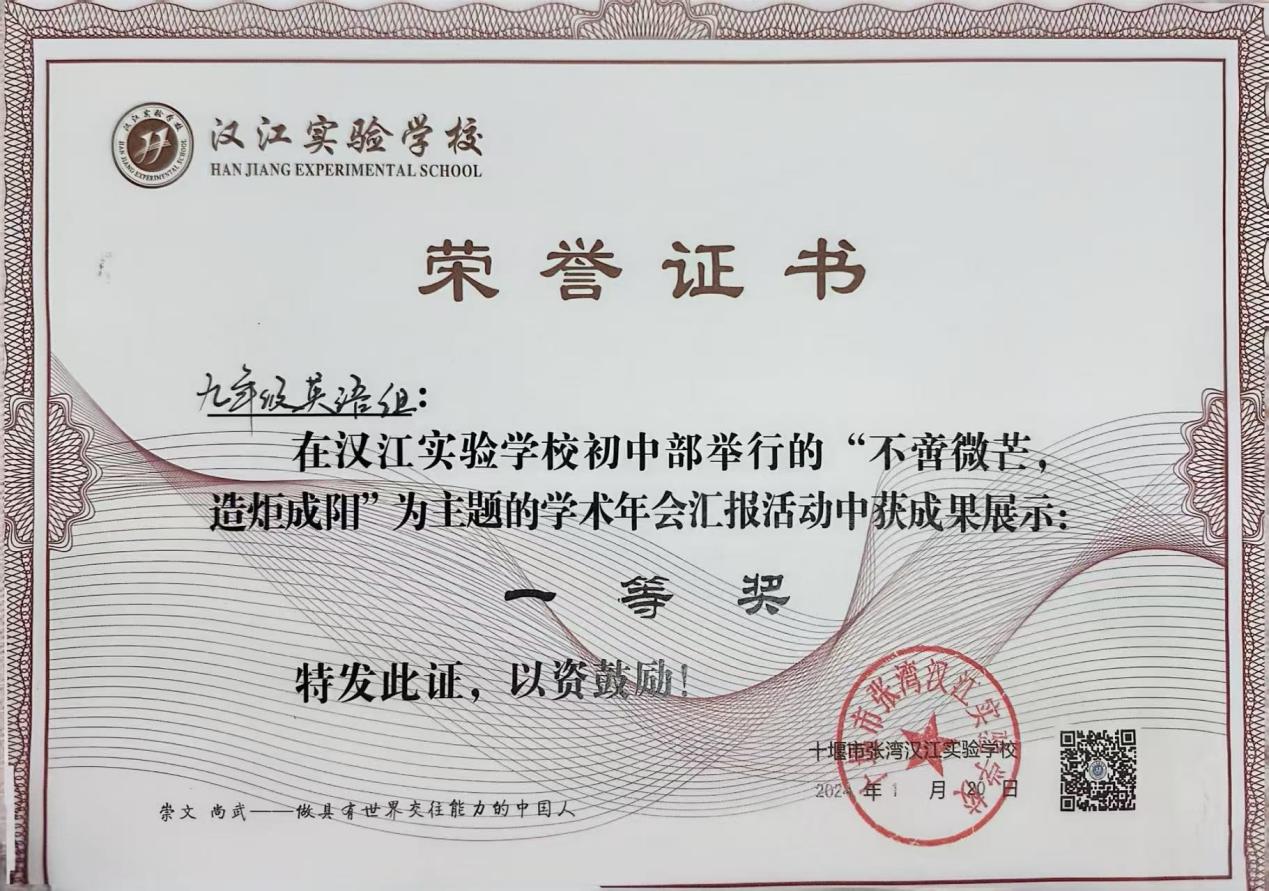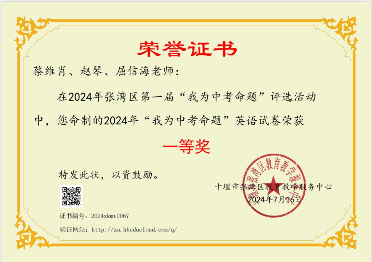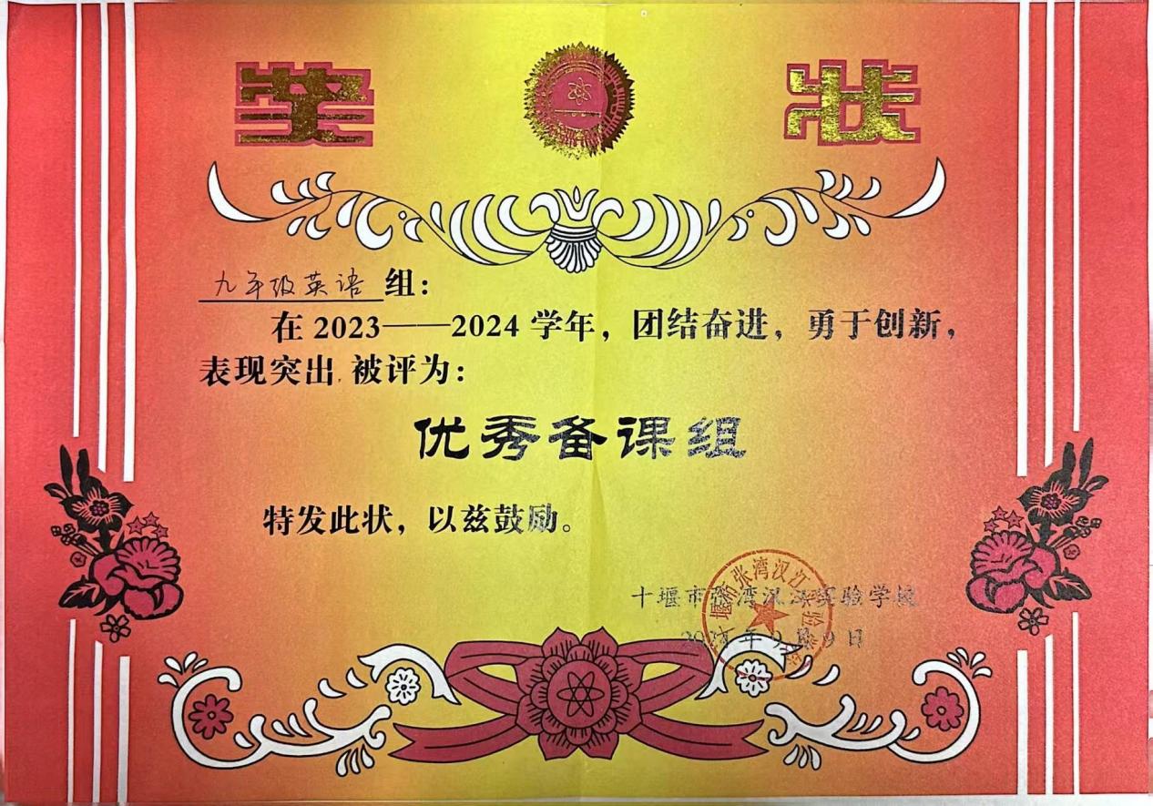 在蔡老师的带领下,七年级英语备课组老师不断丰富自己的教学经验,以饱满的热情和积极的态度参与课题研究和比赛活动,从而进一步提升个人的专业水平。备课组在张湾区第一届“我为中考命题”大赛中分获一等奖和三等奖;在2024年被汉江实验学校授予“优秀备课组”称号。