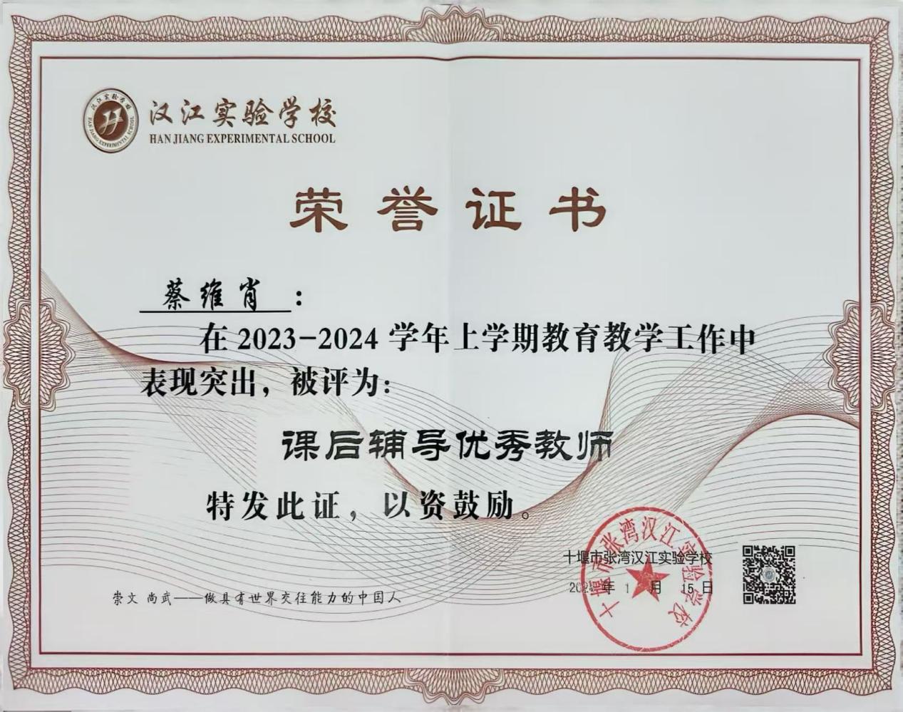 蔡维肖,中共党员,汉江实验学校初中部七年级英语教师。她在一线从教13年,是教育征途上的默默耕耘者,面对挑战从不畏惧,勇于担当重任。她在新中考改革的浪潮中,稳扎稳打,初露锋芒;在学术年会的舞台上展现风采,无私分享宝贵经验;在各类教学大赛中屡获佳绩,彰显卓越才能;教研活动中更是见解独到,深受同行赞誉。