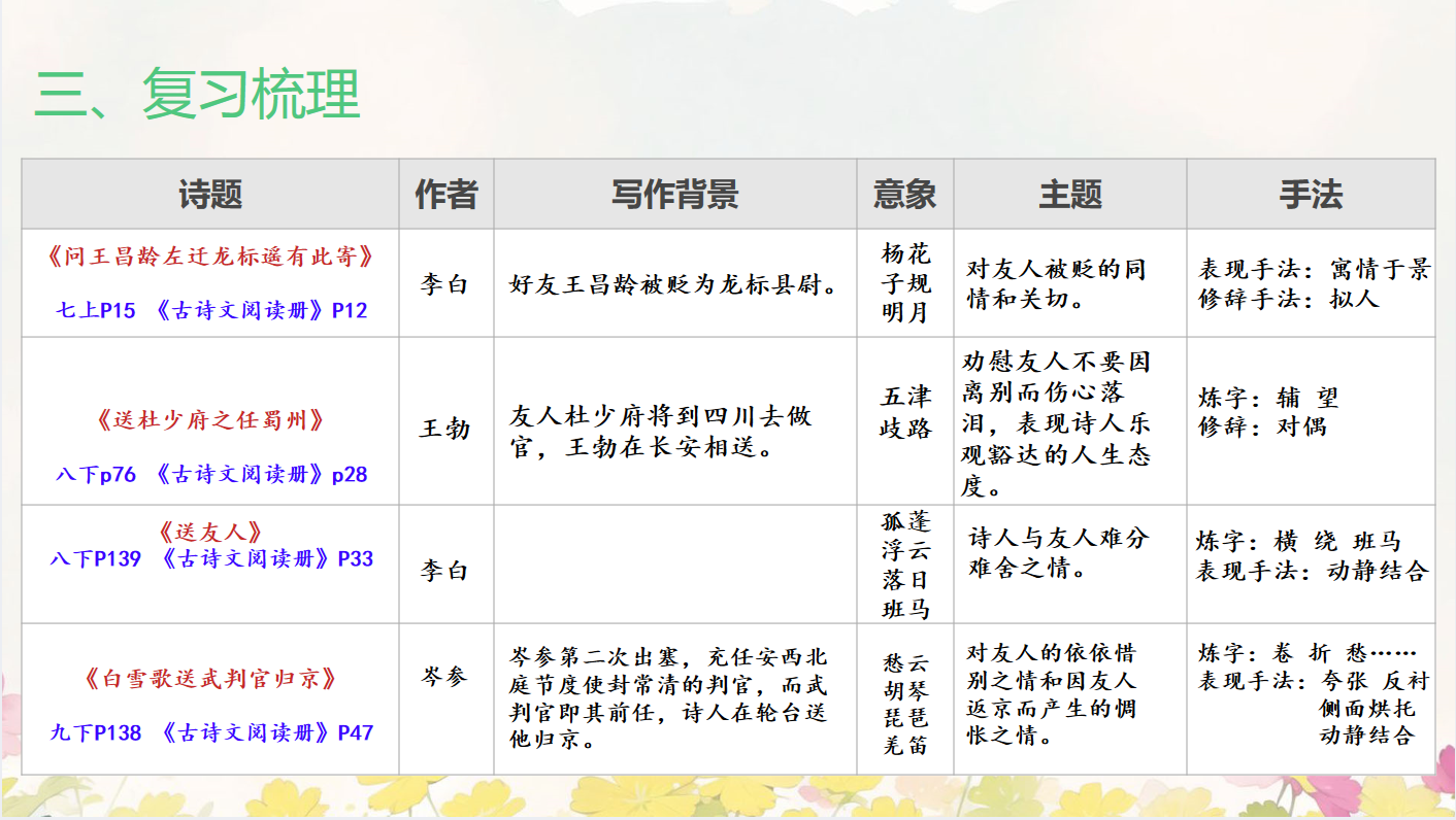 翁老师在教学中始终注重突出学生的主体地位,设计丰富的课堂活动,调动学生积极参与。复习课内古诗词时,她指导学生绘制思维导图,从文常、背景、内容、主题、名句、手法等方面梳理诗歌知识点,构建知识体系,并将这种复习思路延伸到文言文、现代文的复习中,同学们积极尝试,小组交流,共同进步。在九年级中考总复习时,翁老师进一步指导学生根据主要意象分类展开主题组诗复习,以“送别怀人”主题为例,指导学生从主要内容、形式标志、常见意象、思想情感方面归纳整理,总结出“找意象—析特点—明作用”的答题思路,从课内古诗走向课外古诗,有效地提高了学生理解课外古诗词的能力。