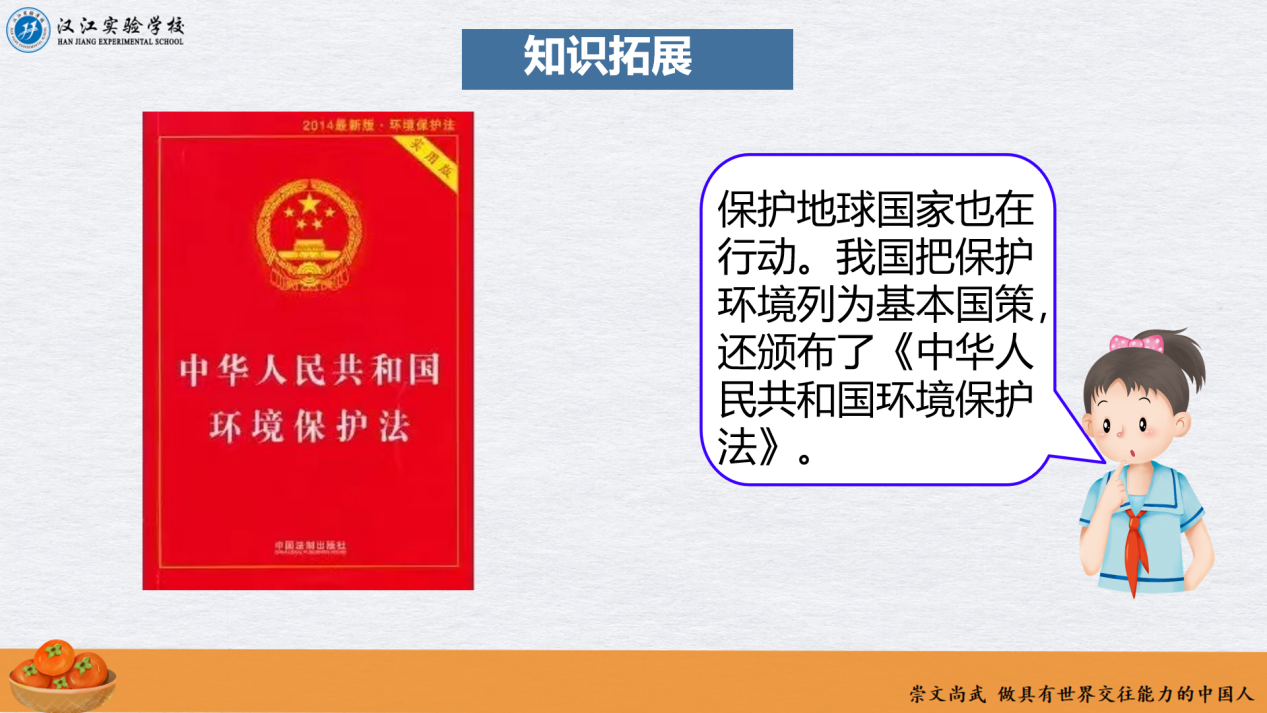 课件的设计要注重教学内容的逻辑合理性。先引导学生意识到环境问题的重要性,再将环境保护与法律结合进行解读,让学生进一步了解国家在生态环境保护方面做出的努力,从而培养学生对国家、社会的关注与关心。