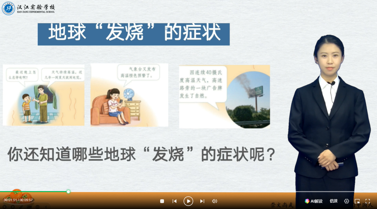 孙暐然老师的教学设计提纲挈领,以清晰的思路,让学生充分了解环保的重要性。谢雨老师的精美课件,利用全球变暖导致的冰川融化、海平面上升、受灾地区的现场画面等素材,给学生带来强烈的视觉冲击,从而引发学生思考。
