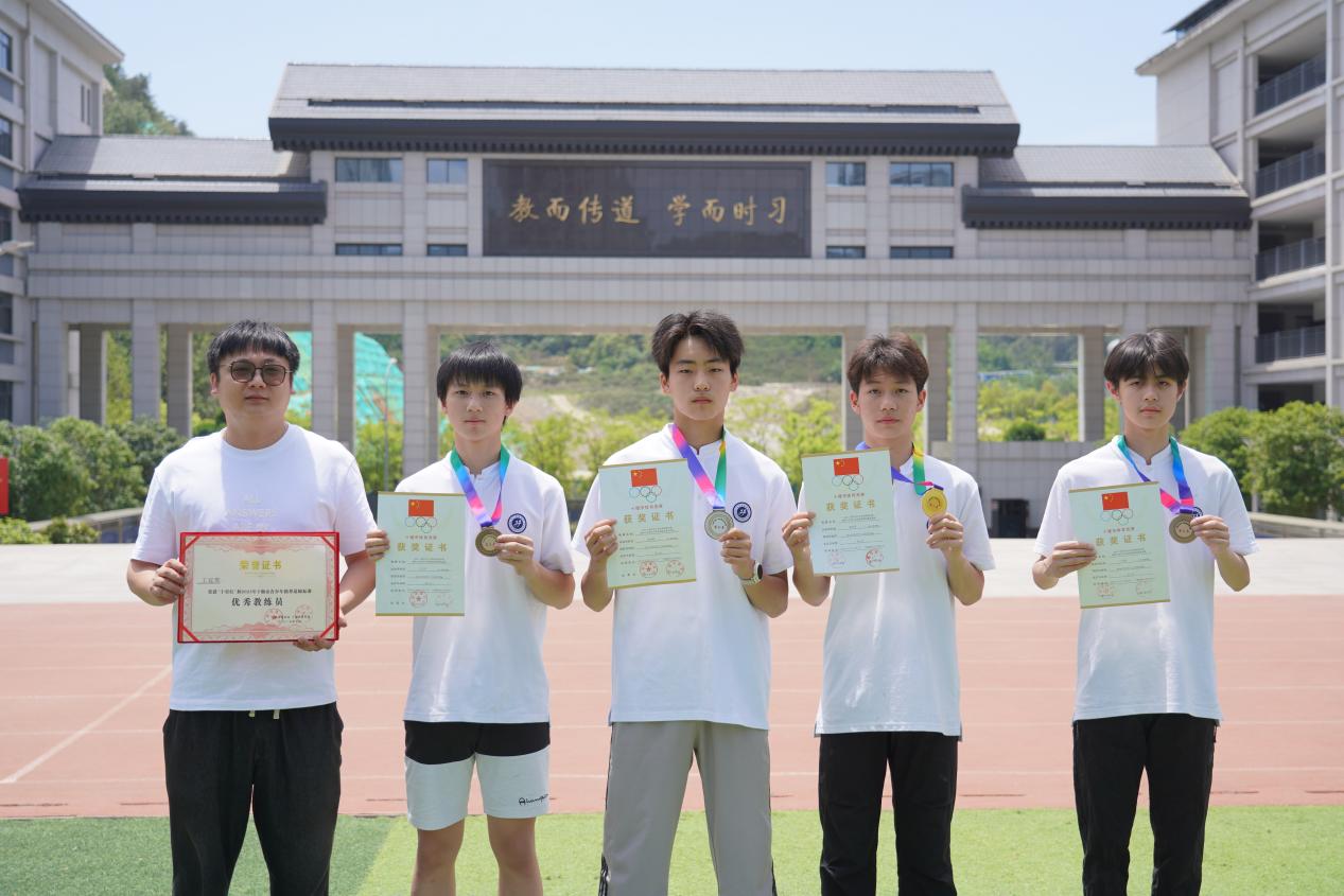 左一:王延辉(教练员) 左三:王子昊   左四:向勃睿  左五: 方书煜   左六:蔡友炜   右一:朱旭(带队老师)   右二:袁康(带队老师)