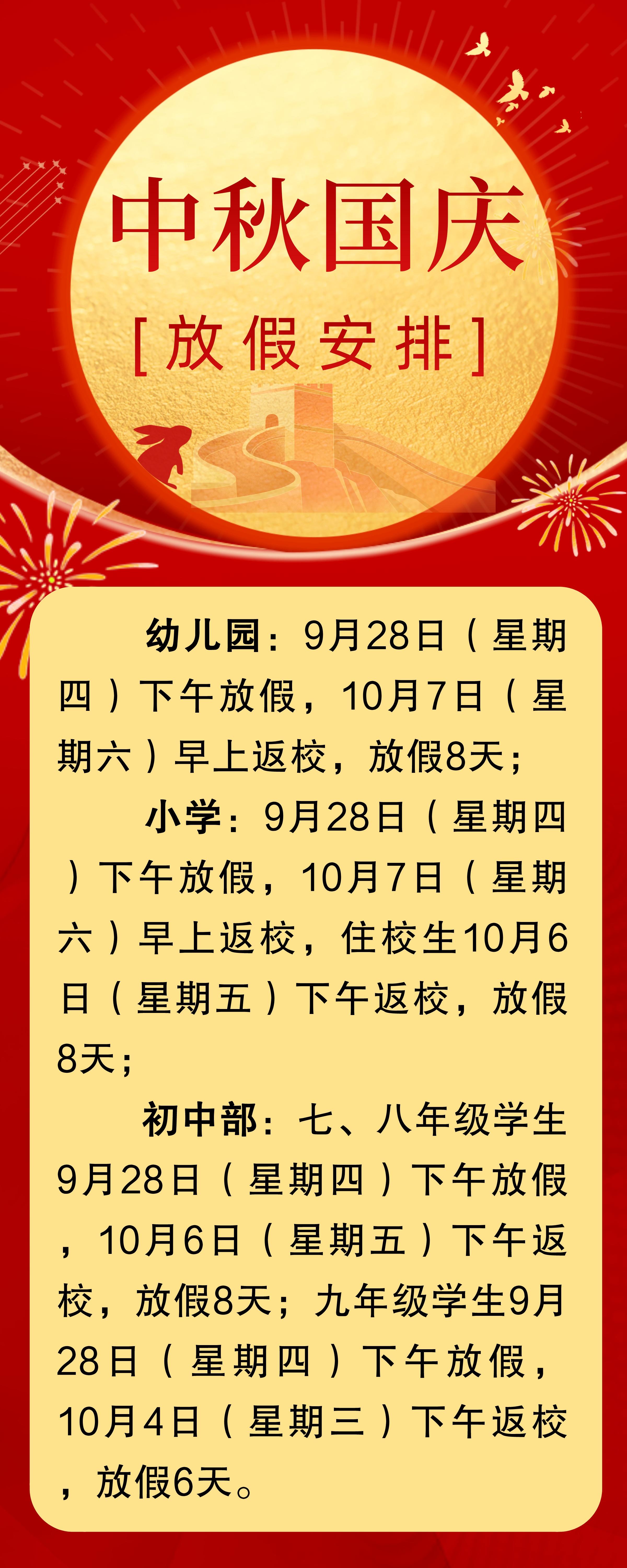 感谢您一直以来对学校教育教学、管理服务工作的理解、关心和支持!值此“中秋节”“国庆节”来临之际,汉江实验学校向您及家人送上最诚挚的节日祝福!在“双节”到来,家国同庆之际,为了让学生度过一个平安、快乐、充实、祥和的假期,现将国庆放假有关事宜通知如下: