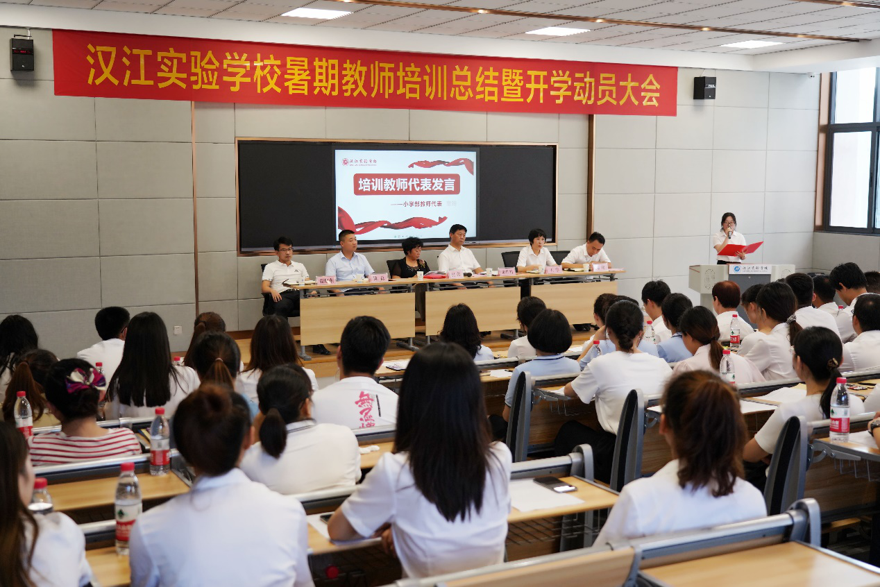 初中教师齐建平、小学教师童玲、幼儿园教师李霄琨作为教师代表分别作了《学无止境,大爱无疆》、《我骄傲,我是汉江实验人》、《以匠心,致初心》的发言,他们从师德师风、家校沟通、个人成长、学校发展等方面畅谈了自己的工作感悟和教育心得,真挚的情感获得了全场教师员工的深深共鸣。