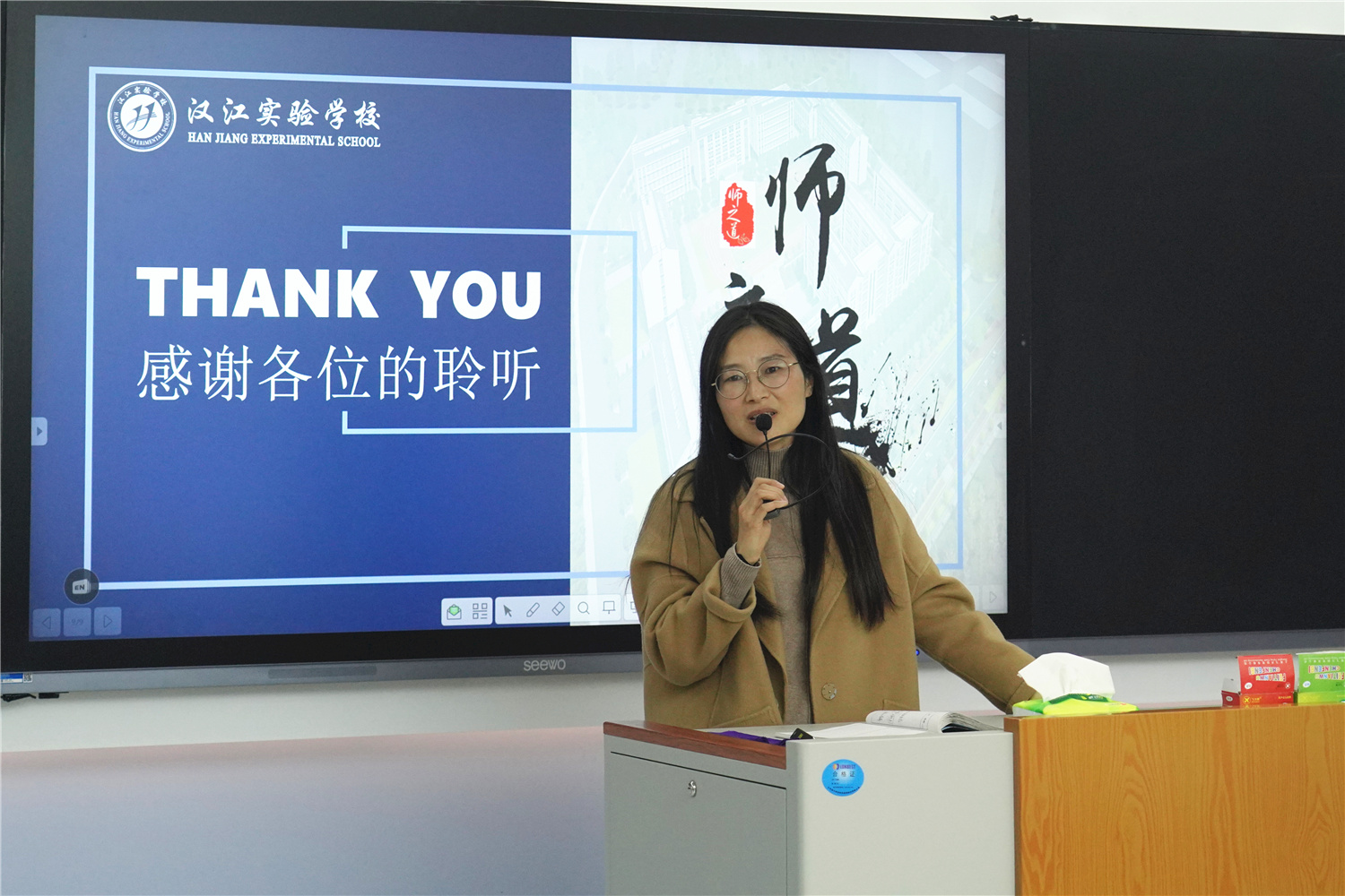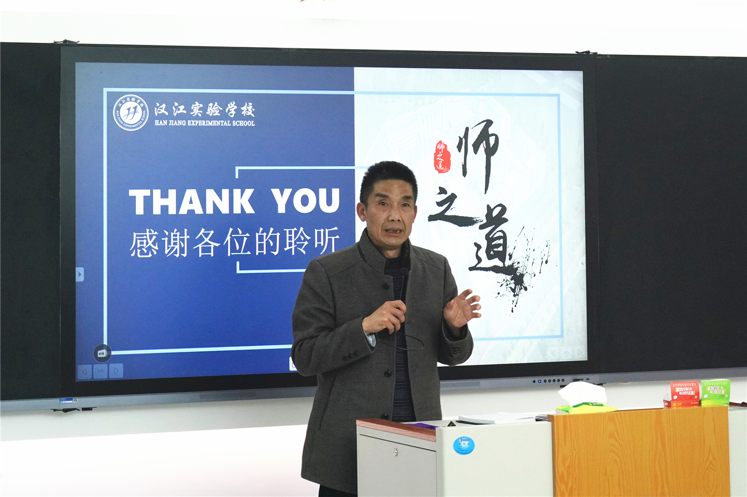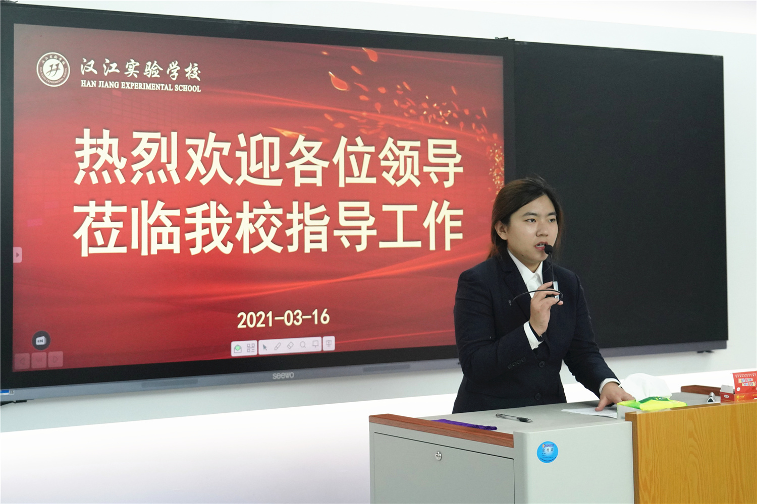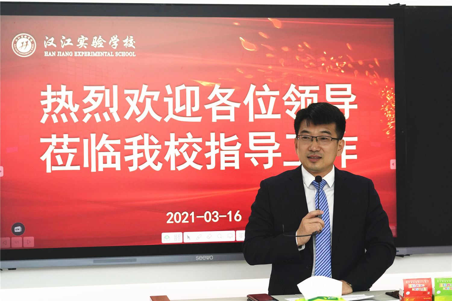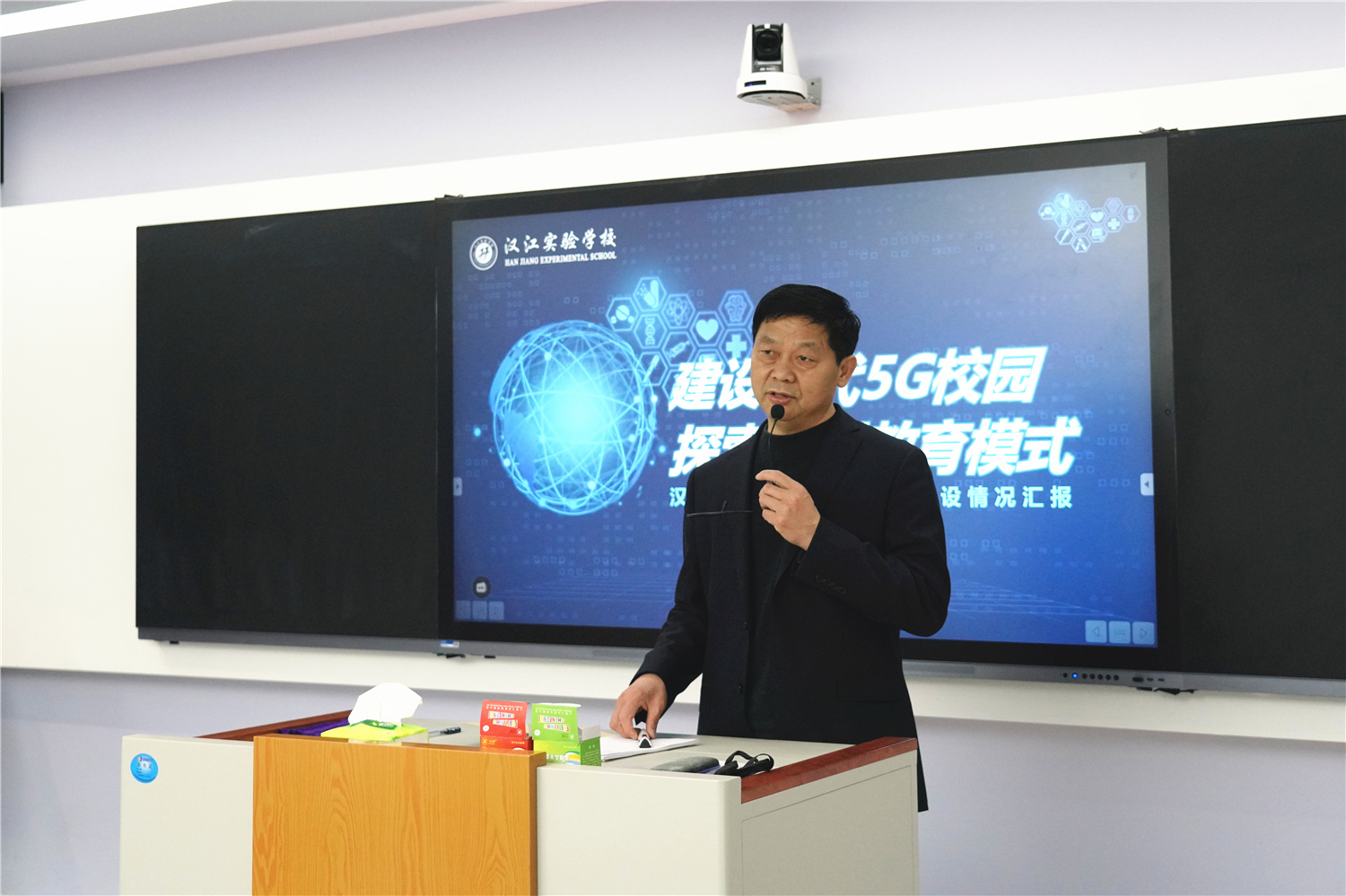 在未来教室,我校校长朱仕竹作了《汉江实验学校智慧校园的构建与应用情况》的报告;我校小学语文老师单若华、初中英语教师屈信海作为观摩课教师代表分享了一线教师熟练应用信息化教学软硬件、打造高效常态化智慧课堂的经验与心得。课堂观摩、报告分享、经验交流,内容扎实的参观交流活动,让来访嘉宾感受颇多。骆总、梁董、王主任表示,我校在5G智慧校园建设方面取得的有效经验,对未来他们在开展智慧校园建设、教师信息化素养提升等方面工作具有重要的指导意义。