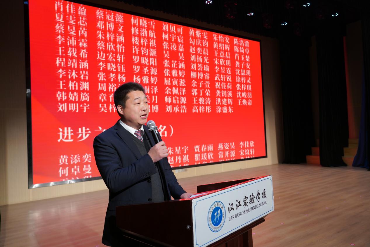 汉江实验学校副校长陈磊宣读《关于表彰2021-2022学年度上学期优秀学生的决定》。