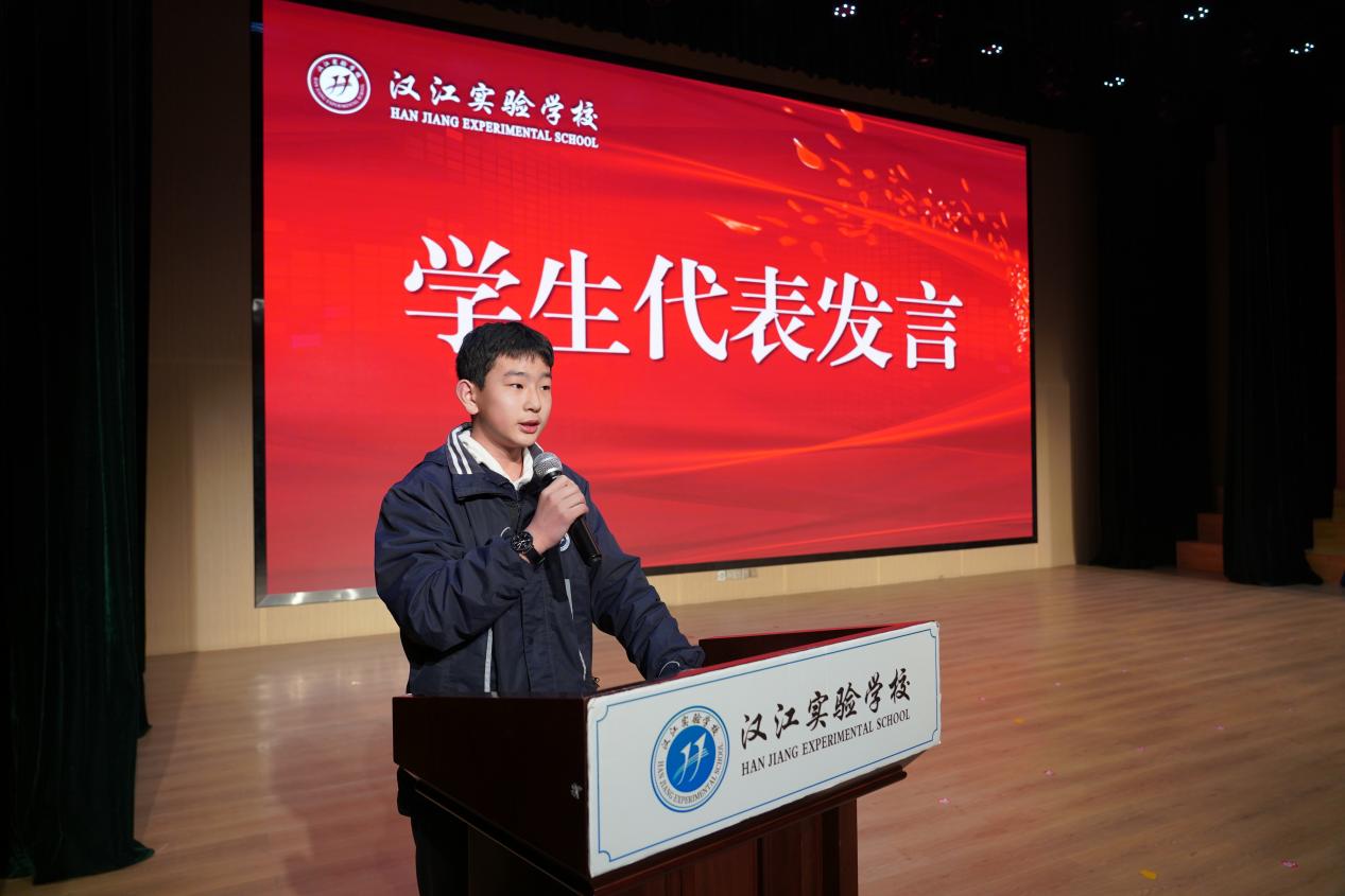 学生代表八(1)班朱胜东发言,他回忆了过去一年里我校日新月异的变化,对全体汉实教师的倾情付出表示感激。同时,他为九年级的学长学姐们鼓劲加油,并号召全体汉实学子以榜样为力量,刻苦钻研,努力学习,向全社会展示汉实学子独有的风采。