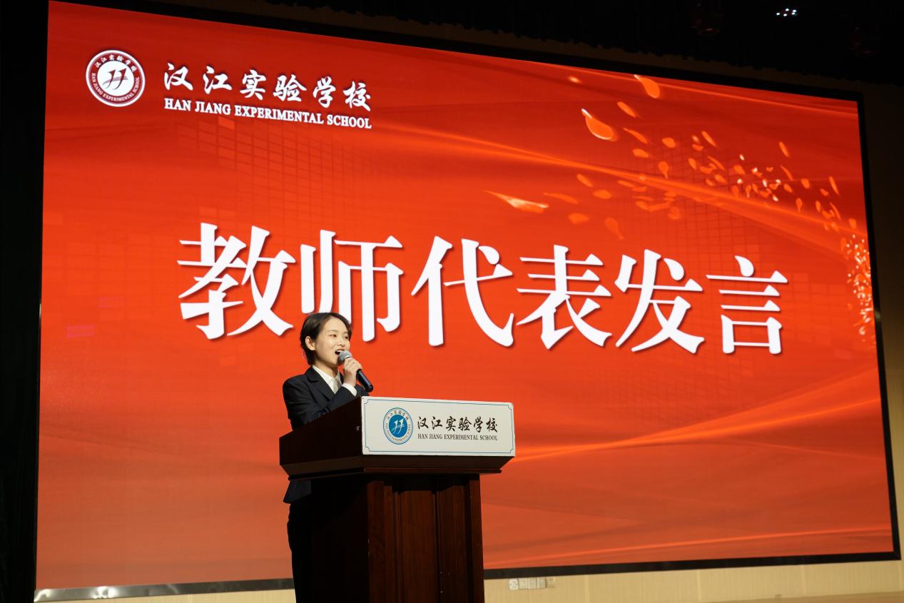 教师代表小学部语文教师杨莹莹发言,回顾了她在汉江实验学校一路上付出的努力,得到的鼓励,收获的成长,并展望新学期,希望自己和汉实全体教师一起怀着热心、爱心、耐心、细心陪伴学生,让每个学生都能在汉实大家庭里健康快乐地成长。