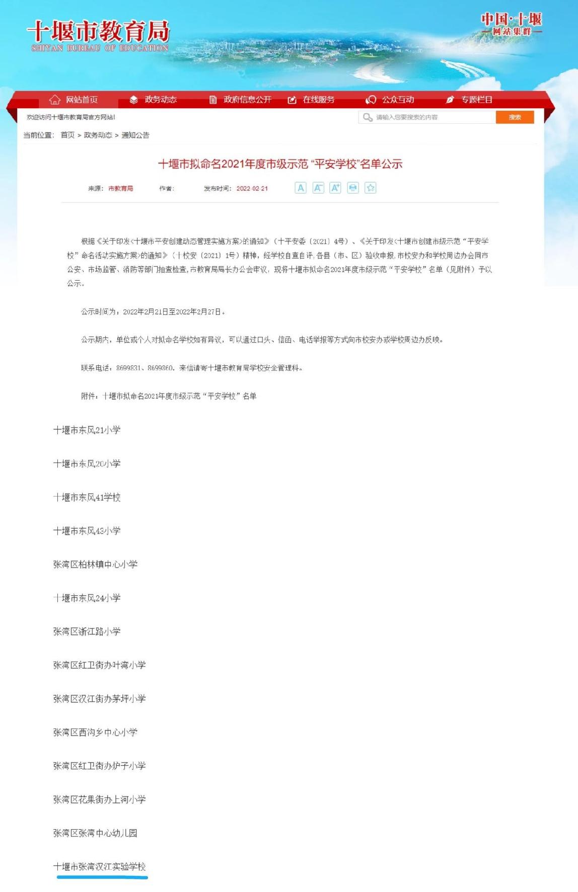 近日,十堰市教育局公布了2021年度市级示范“平安学校”名单,汉江实验学校获得“平安学校”荣誉。