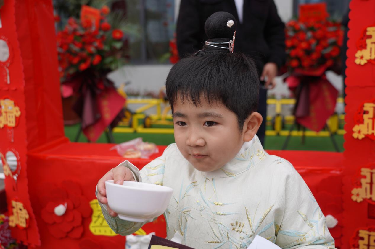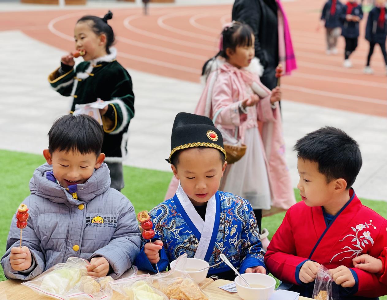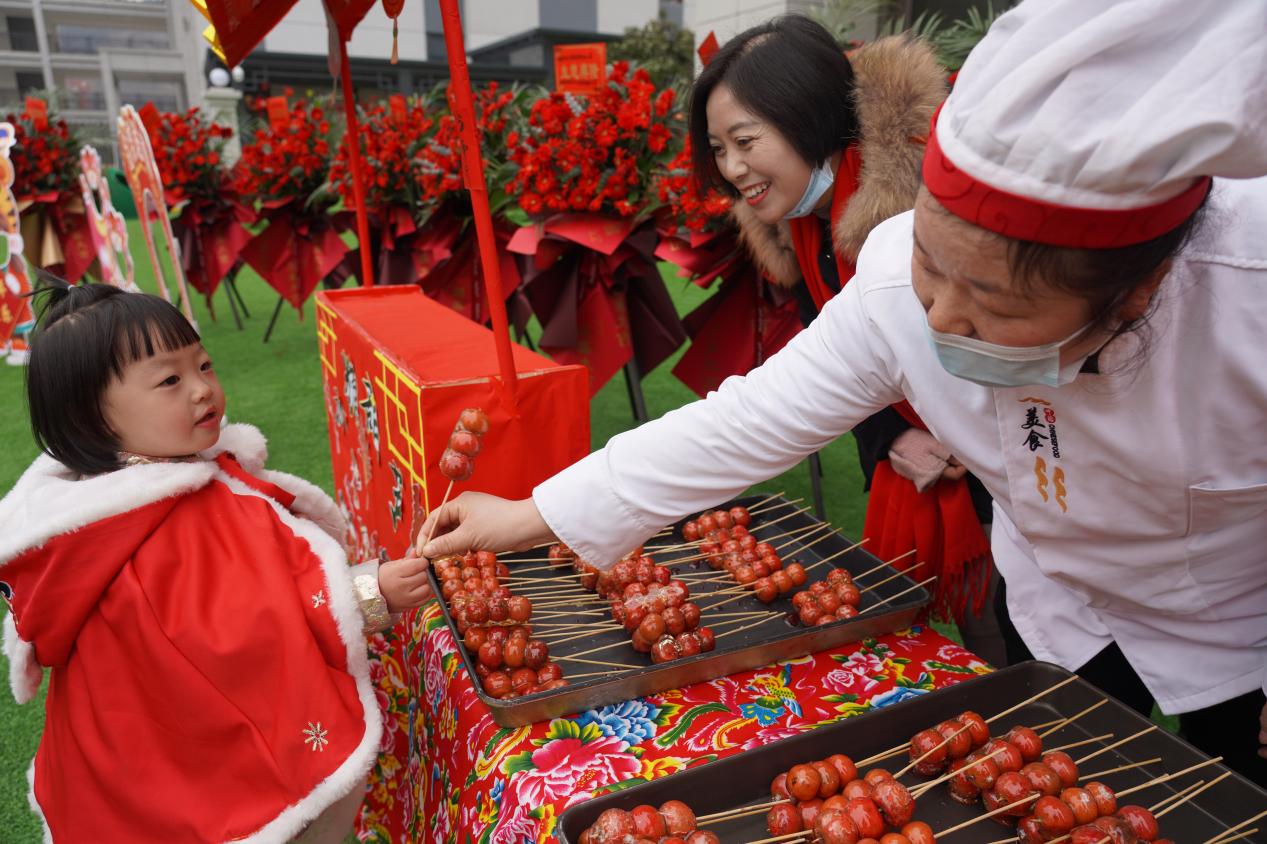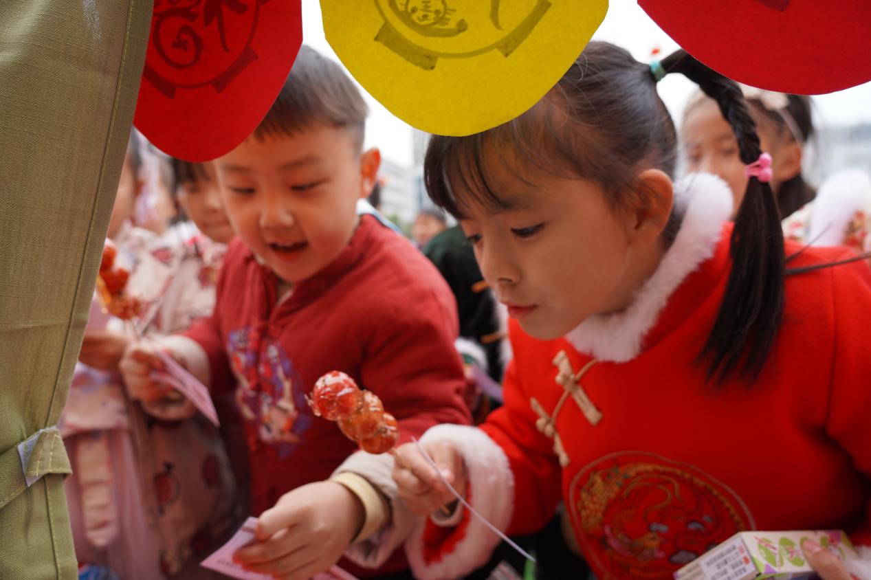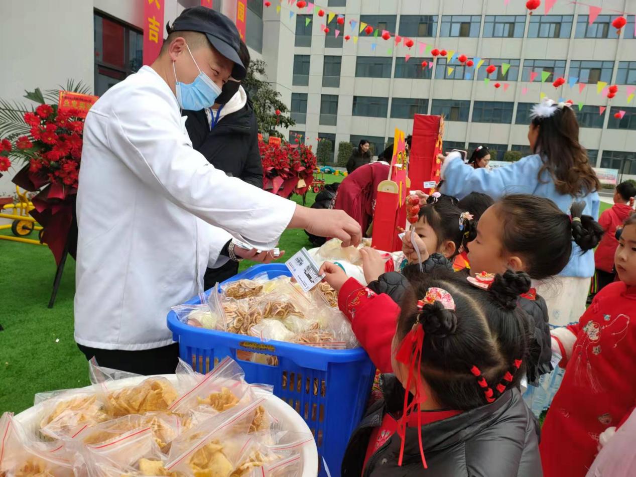 在民俗游玩区,皮影剧场、剪窗花、扎染、活字印刷术......让孩子们亲身参与种类多样的传统活动,了解传统民俗文化。在民俗美食区,孩子们有序排队,用自己赚来的粮票换取喜欢的美食,个个都喜笑颜开。