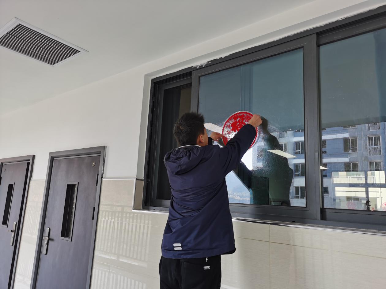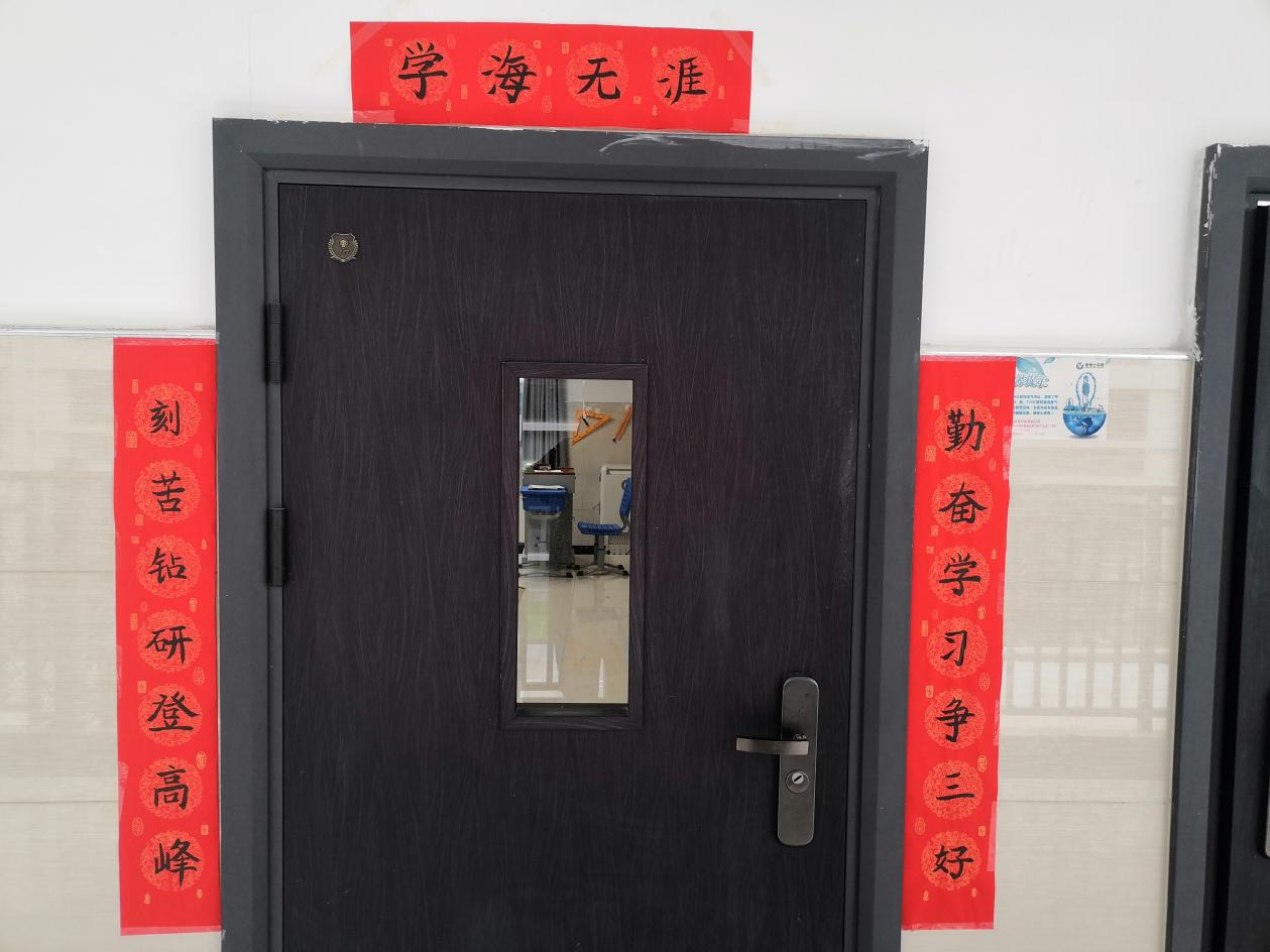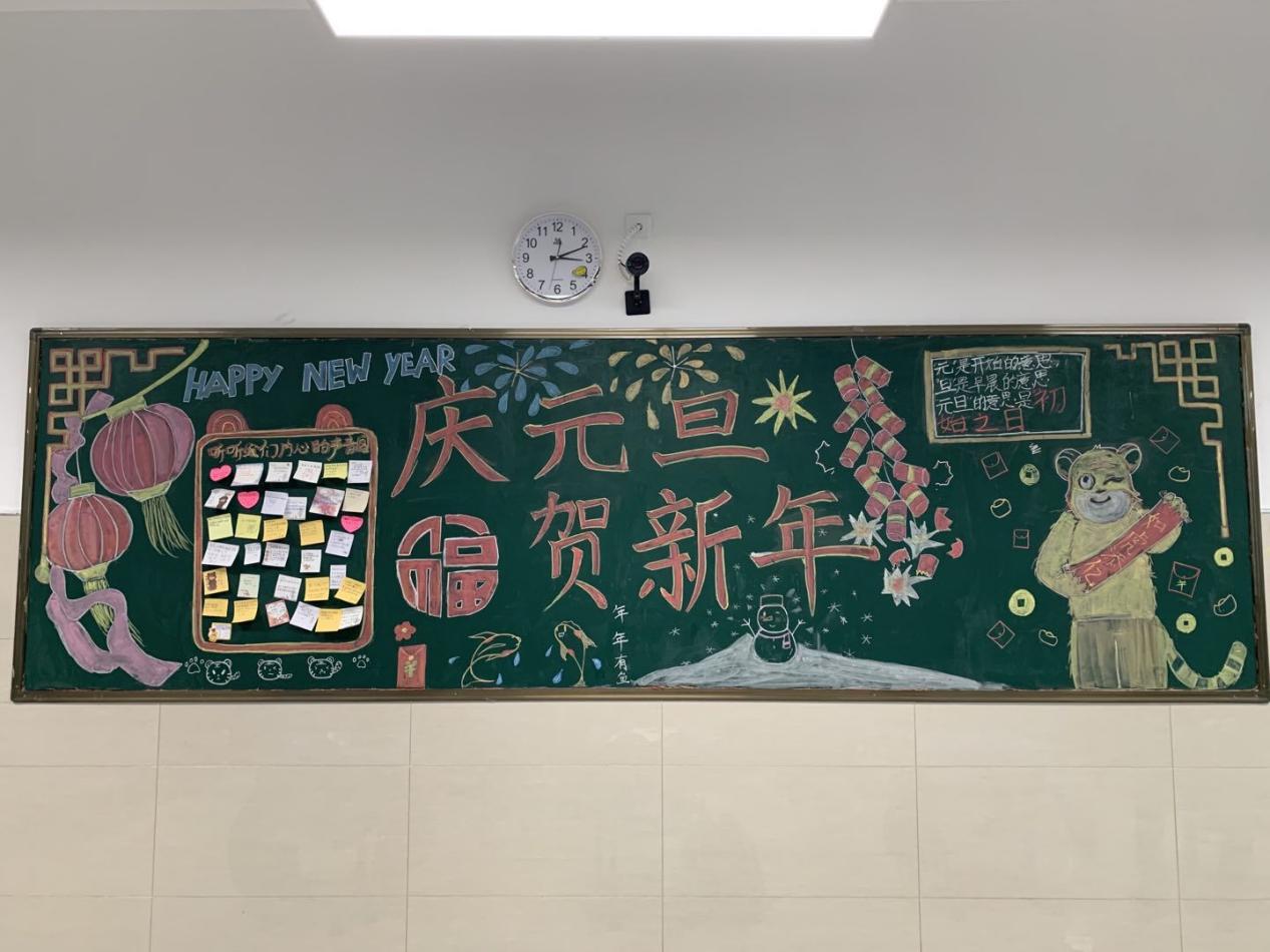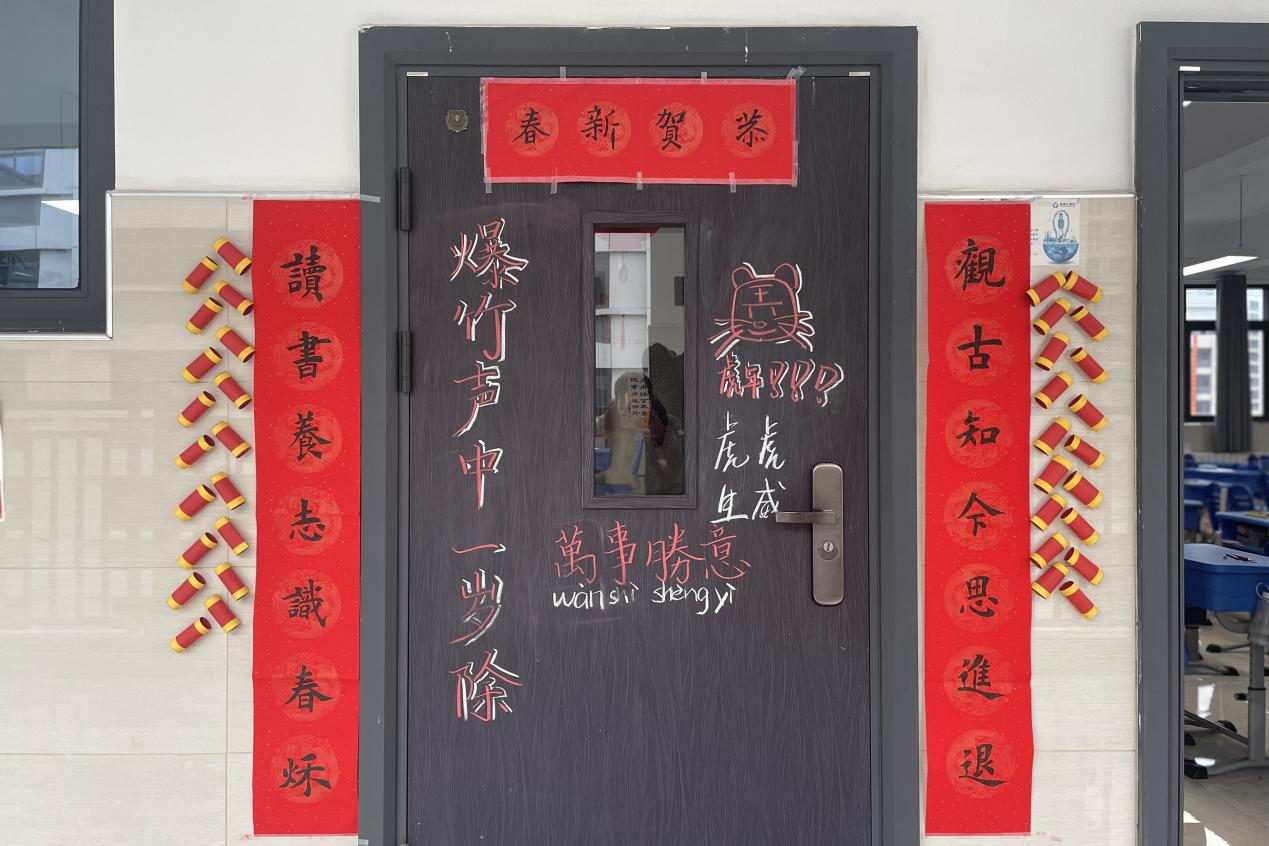 汉江实验学校初中部的同学们在紧张的学习之余,以班级为单位在教室开展元旦主题活动迎接新年。他们发挥自己的想象力和动手能力,将彩带、气球、鞭炮、福字、许愿卡等各式各样的元旦氛围小元素布置在教室里,“年味”十足,好不热闹。张贴在班级门口的新年对联“勤奋学习争三好,刻苦钻研等高峰”,寄予了同学们新年的期待和愿望。