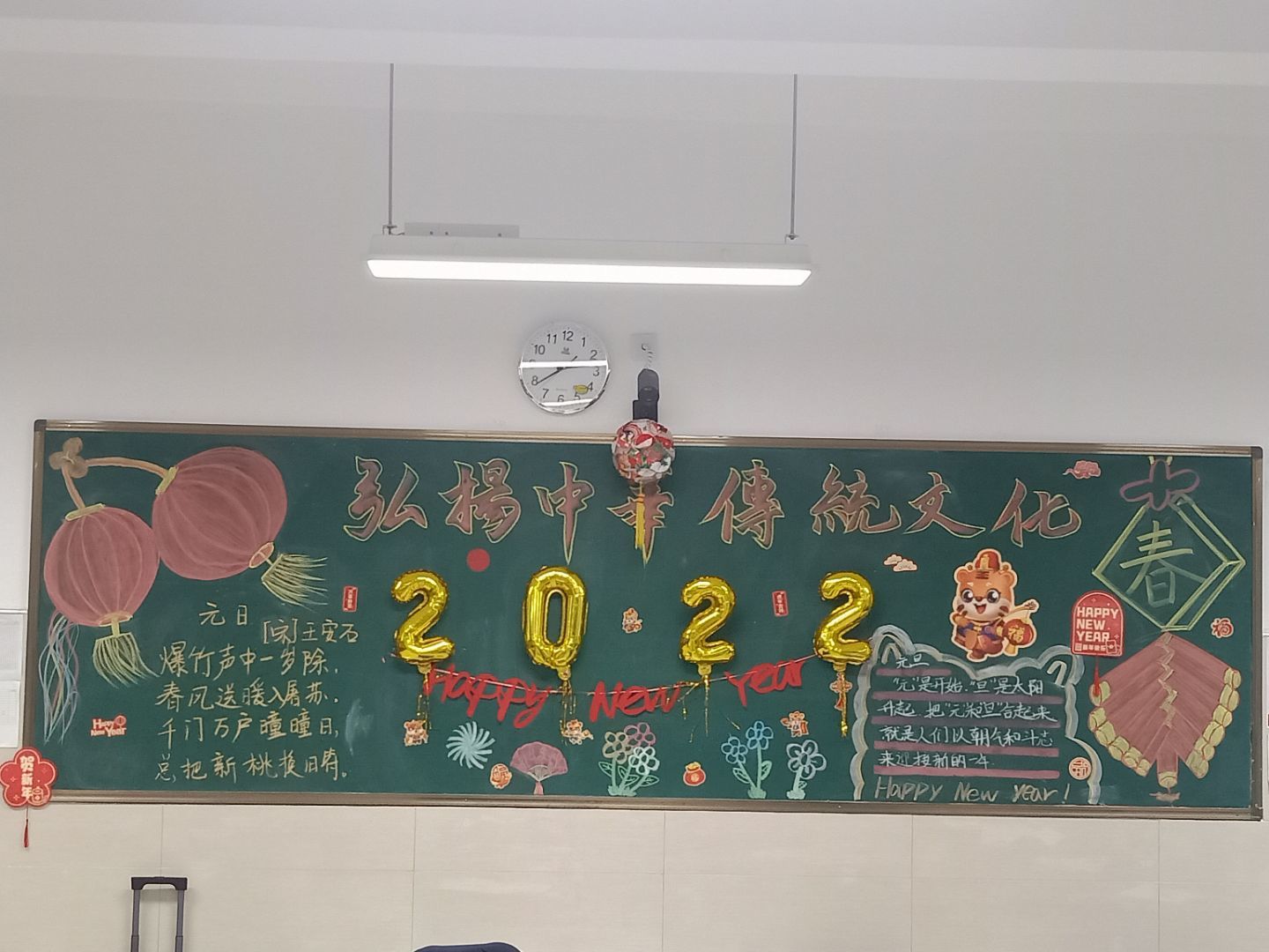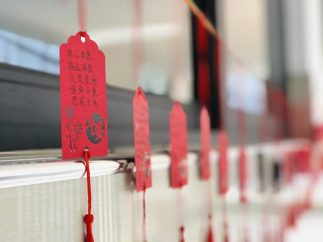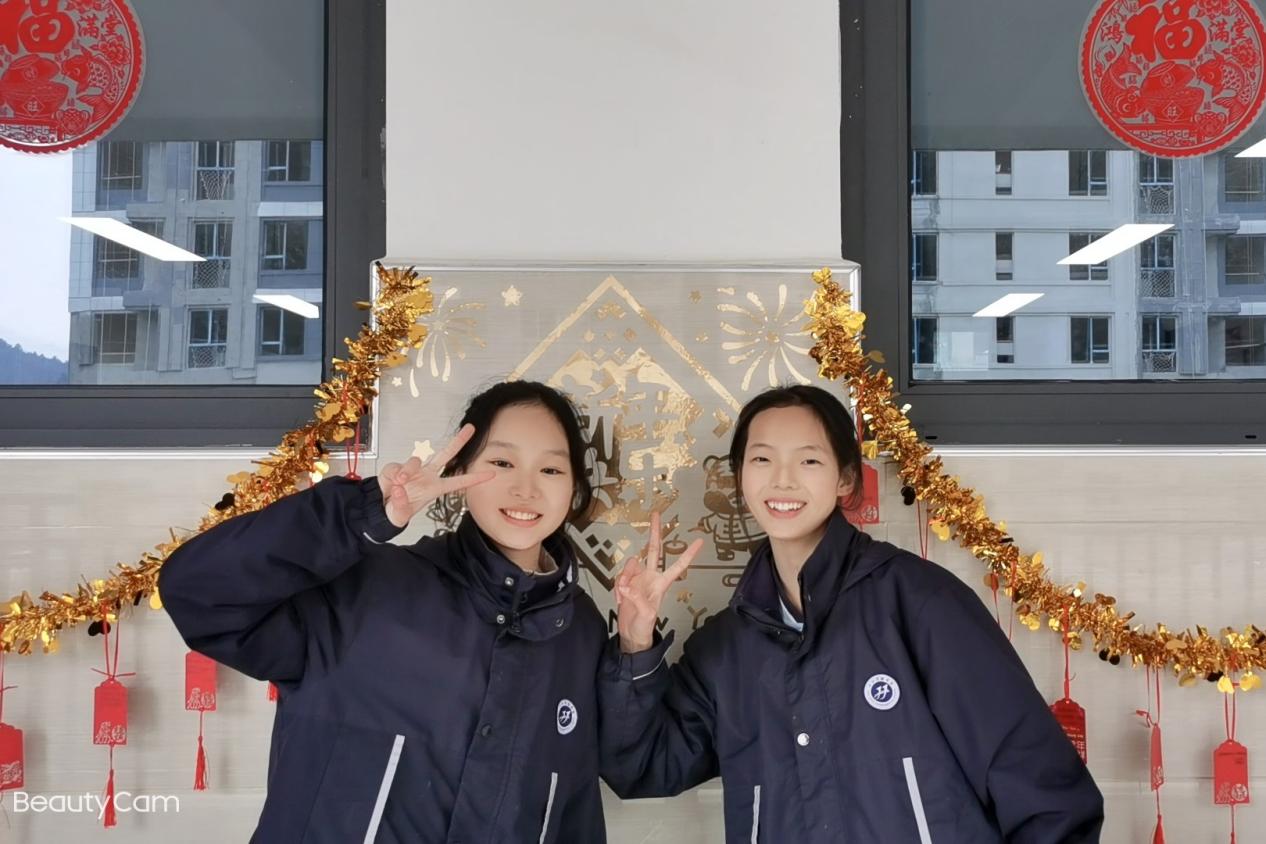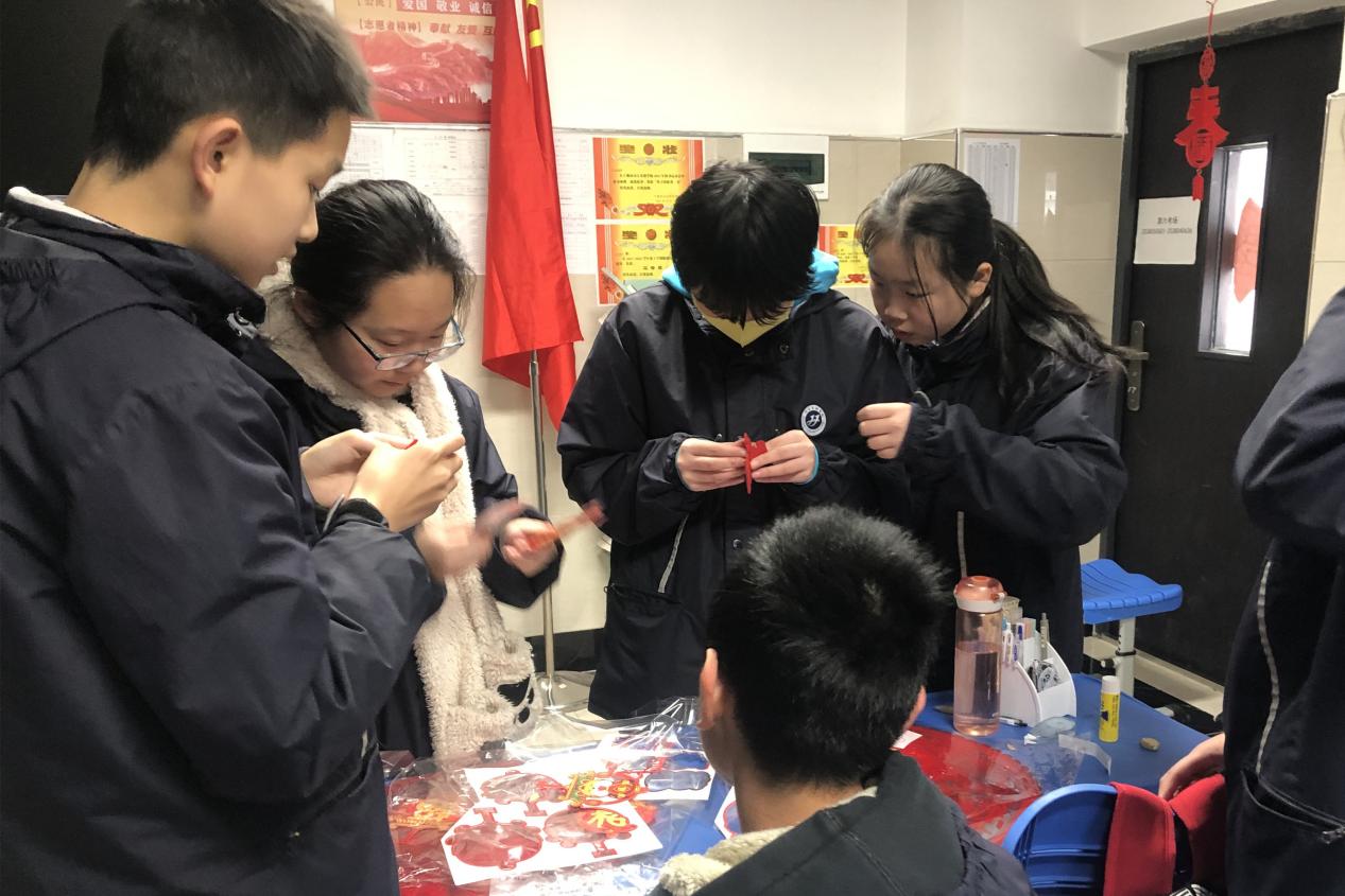 汉江实验学校初中部的同学们在紧张的学习之余,以班级为单位在教室开展元旦主题活动迎接新年。他们发挥自己的想象力和动手能力,将彩带、气球、鞭炮、福字、许愿卡等各式各样的元旦氛围小元素布置在教室里,“年味”十足,好不热闹。张贴在班级门口的新年对联“勤奋学习争三好,刻苦钻研等高峰”,寄予了同学们新年的期待和愿望。