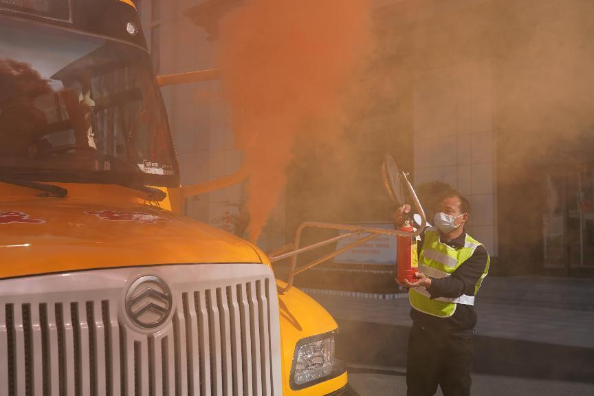 演练开始,车内出现火警,学生呼喊警示车内起火,车辆紧急停靠至安全区域,驾驶员车后紧急摆放三角警示牌,立即取出车载灭火器灭火,各个环节干净利索,反应迅速。学生们在老师指挥下,沉着冷静,遵从口令,一律按照正确的逃生方法,捂住口鼻迅速有序地撤离到安全地点。老师及时稳定现场学生情绪,清点人数后迅速报警,并立即向学校报告情况。整个过程紧张、有序,演练顺利完成。
