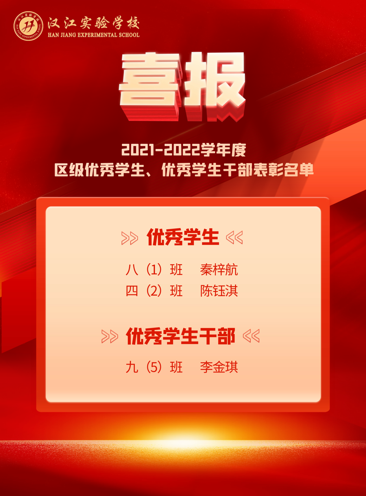 为全面发挥典型的育人作用,激励广大学生奋发向上、崇德向善,经学校评选、公示、推荐,教育局审查批准,汉江实验学校八(1)班秦梓航同学、四(2)班陈钰淇同学被评为2021-2022学年度区级优秀学生,九(5)班李金琪同学被评为2021-2022学年度区级优秀学生干部。