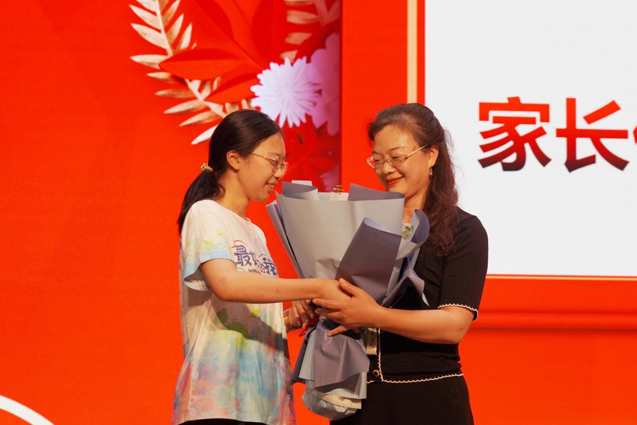 家长代表九(3)班陈淑媛妈妈发言,祝福孩子们学业有成,金榜题名。同时,感激学校的精心培育,感谢老师的辛勤付出,希望孩子们能够不断地充实自己、完善自己,找准自己的人生轨道,用智慧和勤奋创造出辉煌的人生价值。
