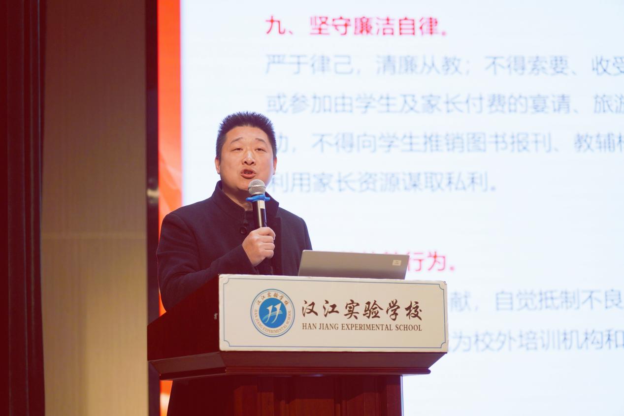 副校长陈磊作《师德师风与安全教育》专题培训,对《新时代中小学教师职业行为十项准则》进行解读,并罗列违反师德师风的具体表现,希望老师们铭记行为规范,严守教师准则,做“四有”好老师,当育人大先生。随后,陈校长从心理健康、交通安全、校车安全等方面对教师做了安全教育培训,要求全体教师要切实落实好各项校园安全工作,为汉实学子营造平安和谐的校园环境。
