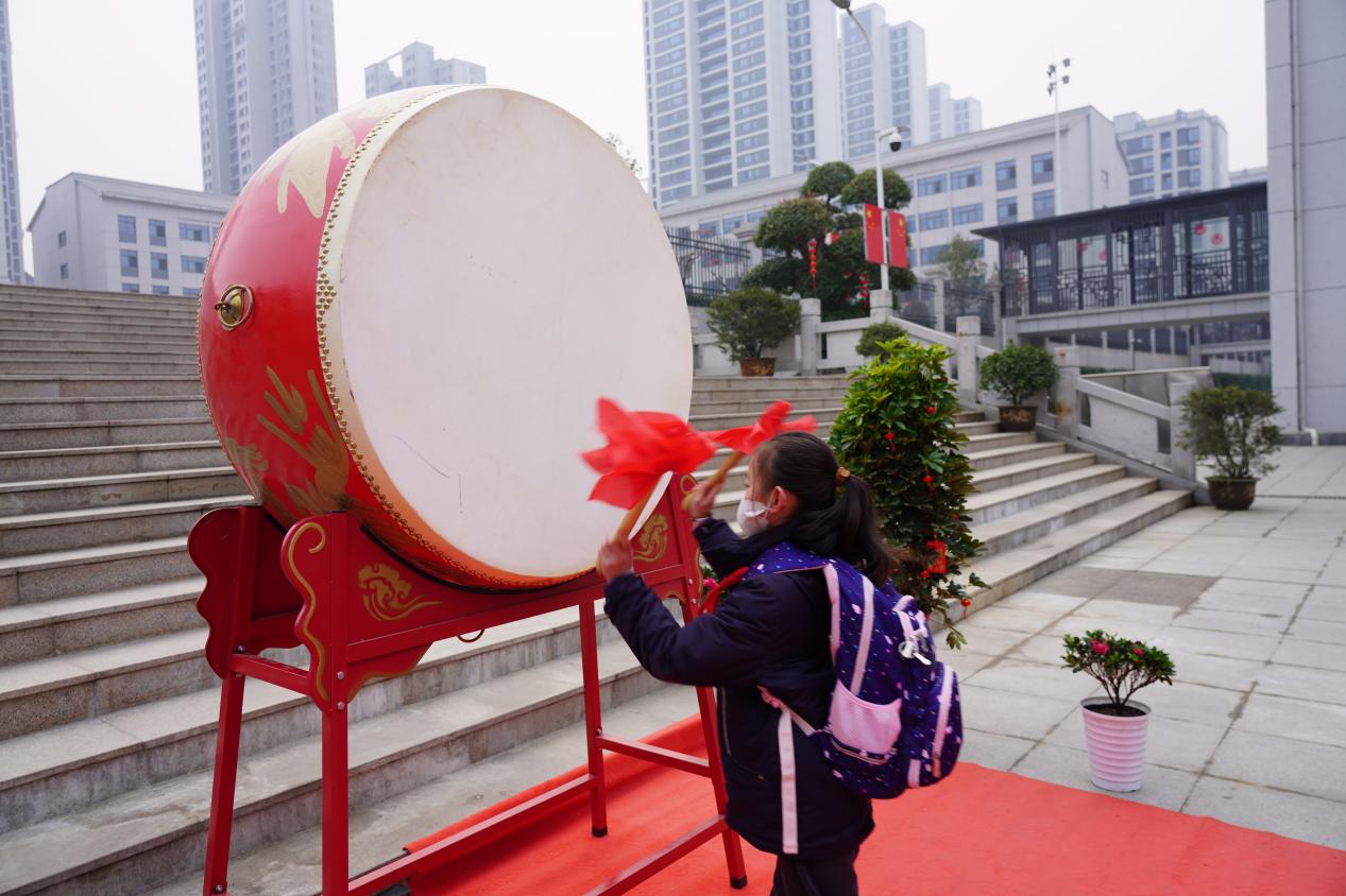 在老师的引导下,同学们走过长长的红毯,举起鼓槌,敲出新年的第一声响,预示着新学期学业有成,一鸣惊人。同学们满怀喜悦,脸上写满了对新学期学习生活的向往和期待,纷纷在拍照打卡处留下开学的第一张照片,笑容灿烂,活力满满。