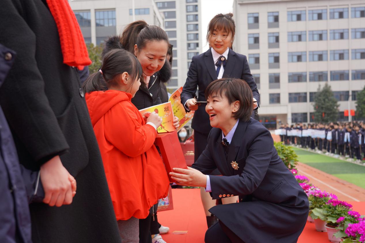 副校长王宇宣读《关于表彰2022-2023学年度上学期“汉实之星”的决定》。董事长何蕾向获奖学生表示祝贺,并亲手将精心挑选的书籍赠予学生。每本书都寄托着董事长的殷殷期盼,激励汉实学子们好好学习,在新学期取得更优异的成绩。