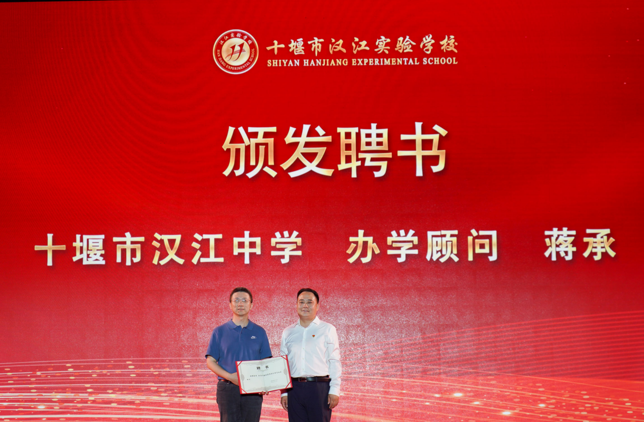 5月31日,在汉实第二届校园文化艺术节暨庆六一文艺汇演上,汉江实验学校党支部书记、董事长陈伟为蒋承教授颁发聘书,聘请蒋承教授为十堰市汉江中学办学顾问。总校长朱仕竹为李亚平教授颁发聘书,聘请李亚平教授为十堰市汉江中学家长学校首席专家。