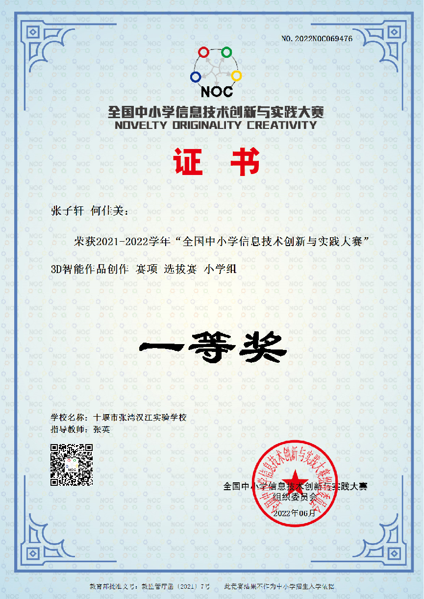 近期,由城乡统筹发展研究中心和中国人工智能学会共同主办的2021-2022学年“全国中小学信息技术创新与实践大赛”初赛结果已公布。汉江实验学校张子轩、何佳美两位同学共同合作完成的作品《多功能无人驾驶垃圾车》荣获大赛3D智能作品创作赛项选拔赛的小学组一等奖,顺利入围全国选拔赛。