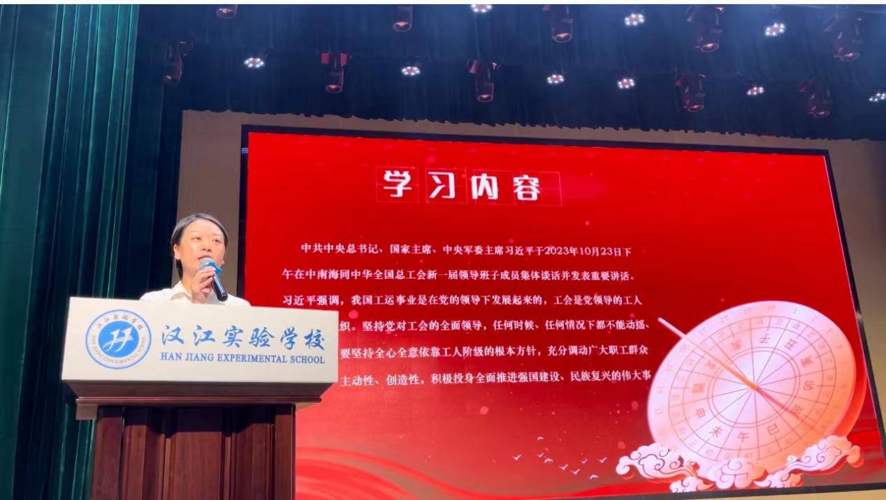 工会主席江玲领学了《关于习近平总书记对工会工作的重要论述》,并向与会教职工阐述:要深入学习贯彻习总书记关于工会工作的重要论述,充分发挥工会桥梁纽带作用,进一步促进教职工参与学校建设和发展,不断完善学校各项规章制度,促使学校高质量发展。